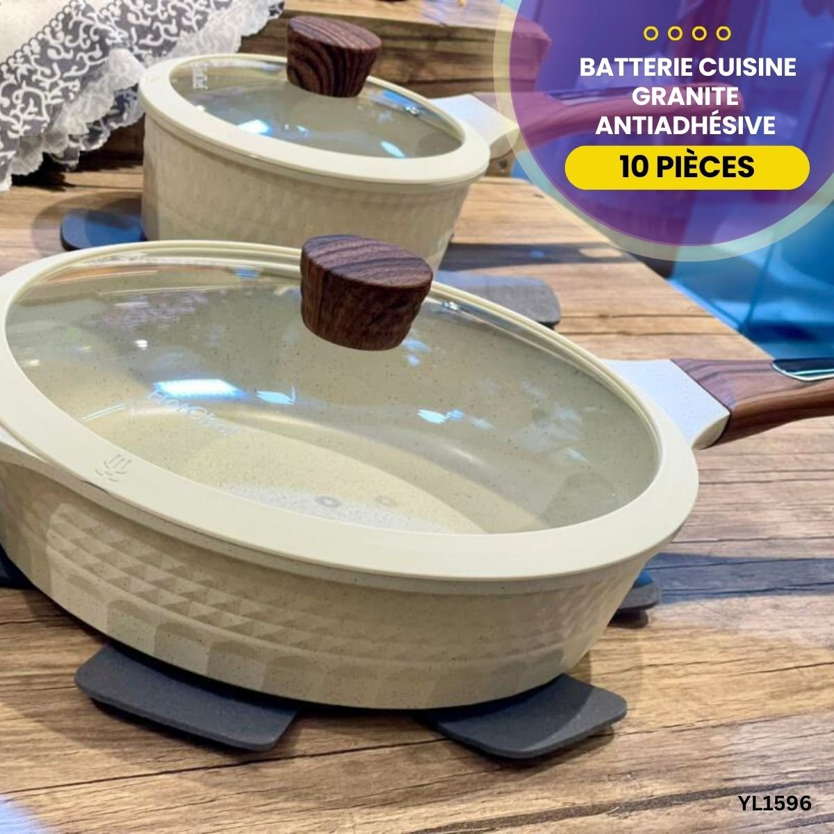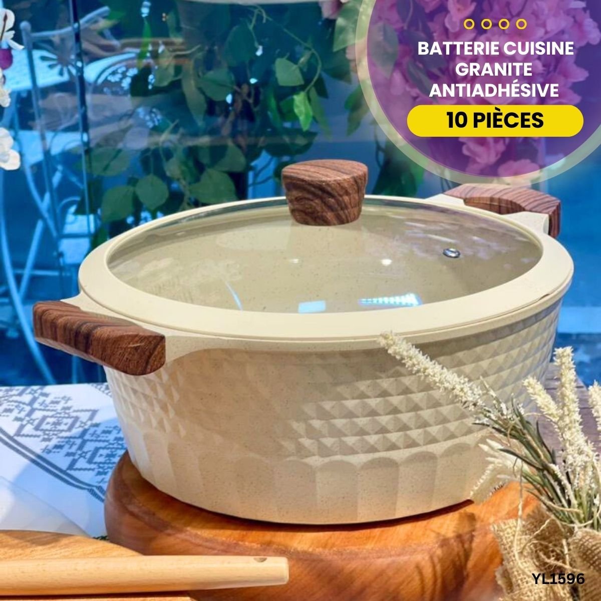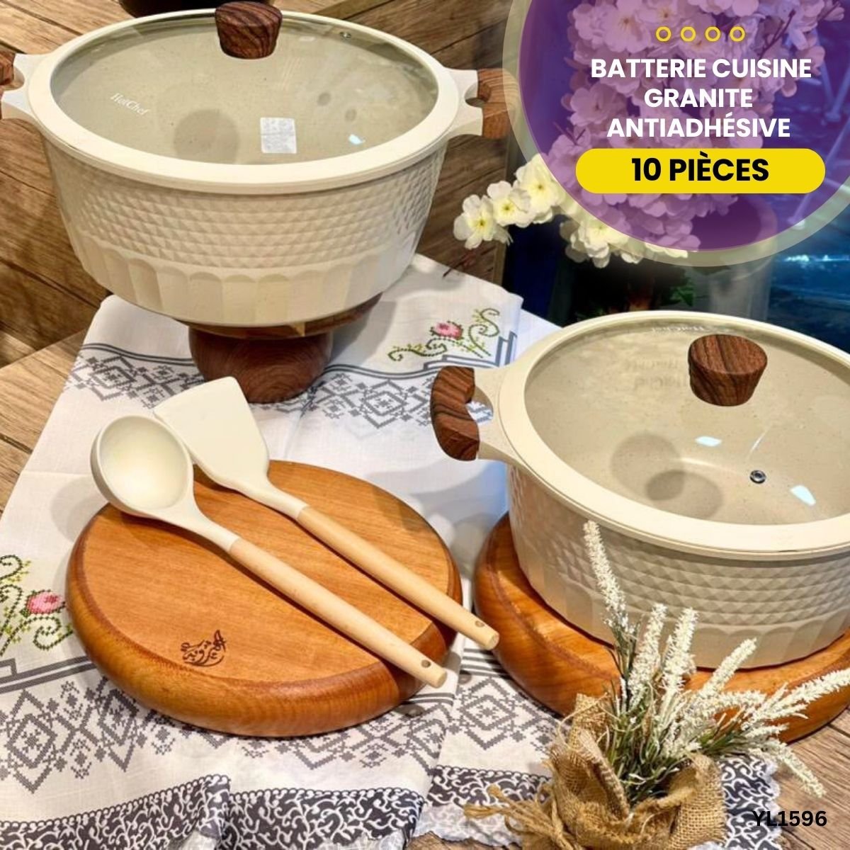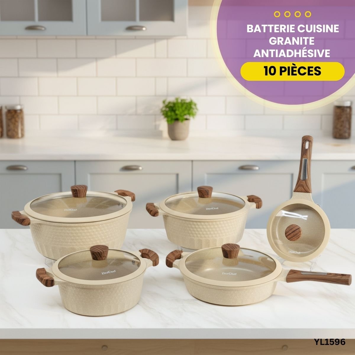 Batterie HotChef 10 Pcs (5 ustensiles, 5 couvercles). Revêtement granite, antiadhésif et durable. Poignées effet bois. Idéale pour cuisine saine.