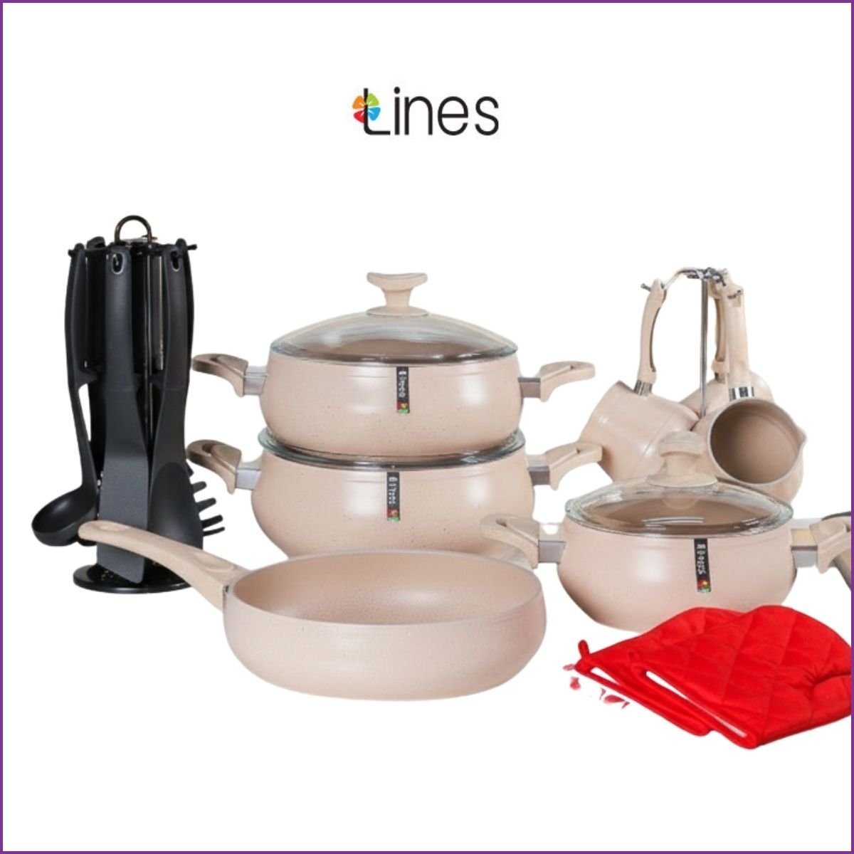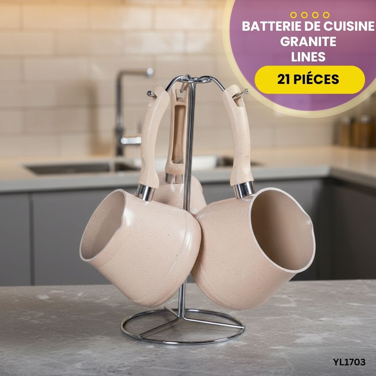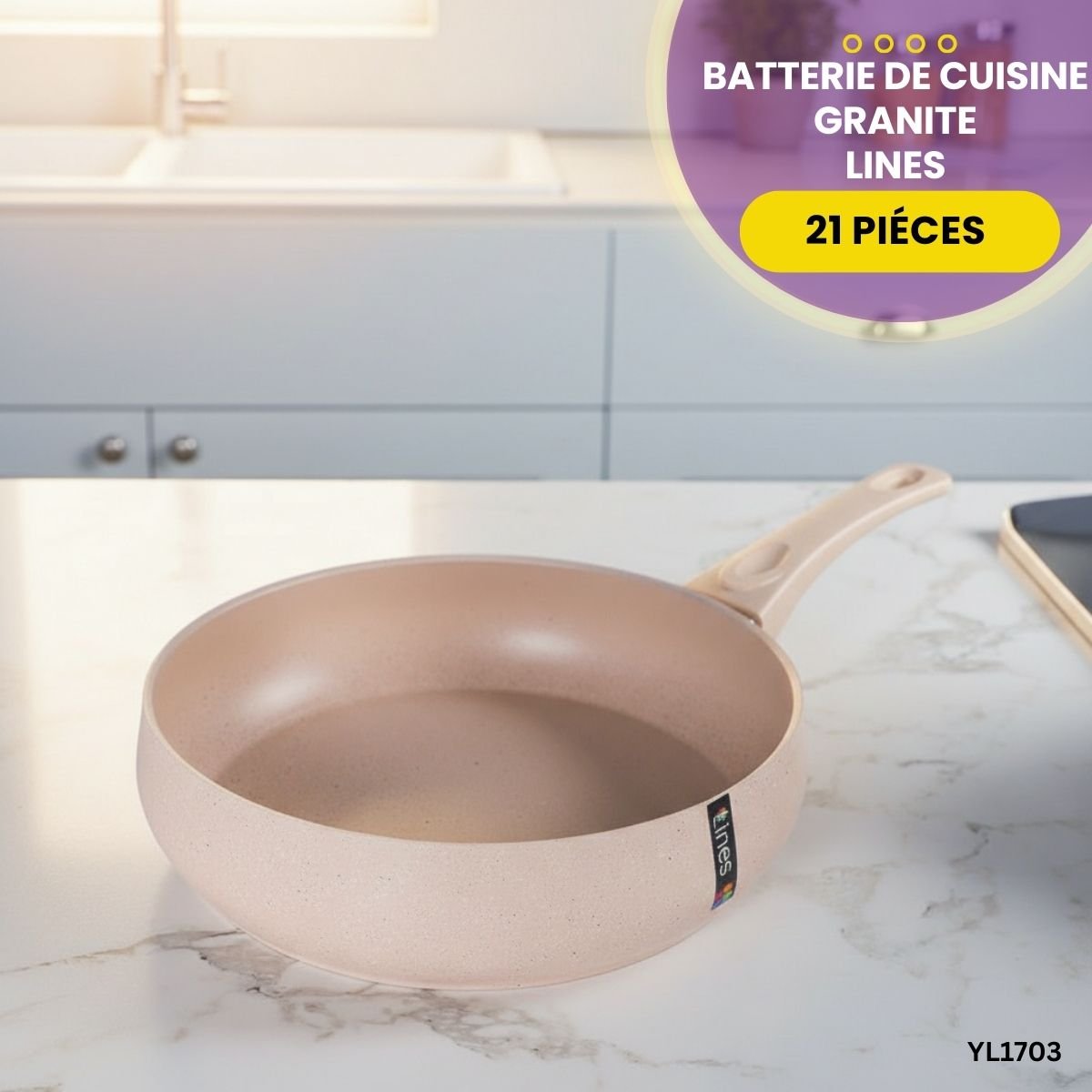 Équipez votre cuisine avec la batterie Lines 21 pièces. Revêtement antiadhésif effet granite sans PFOA, design moderne beige et accessoires inclus.