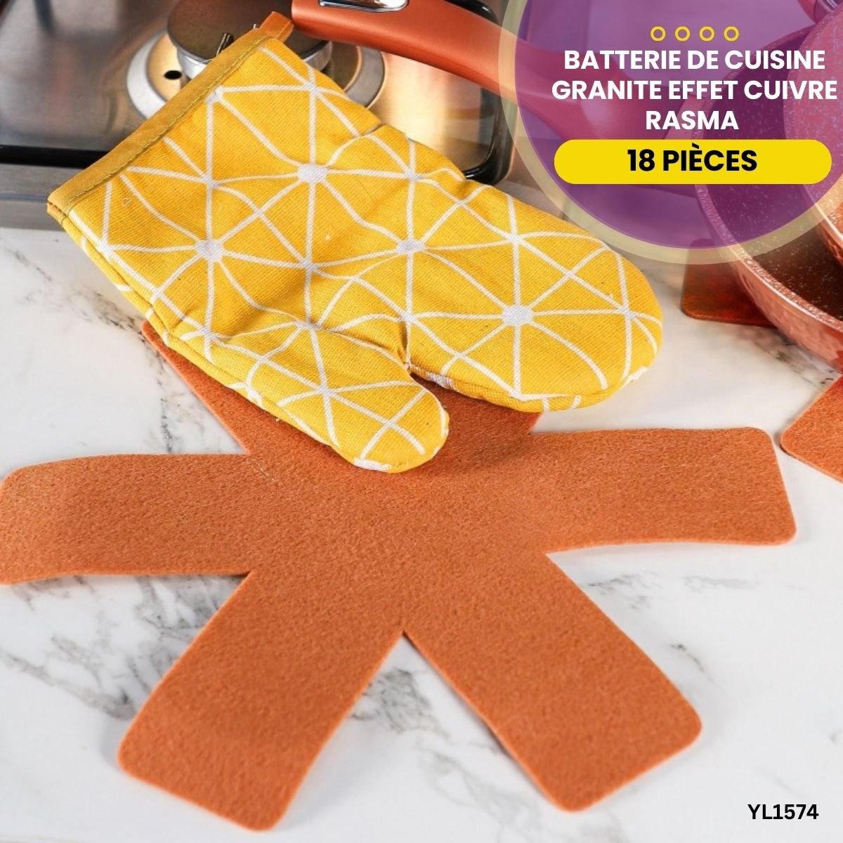 Cuisinez avec élégance grâce au set Rasma 18pcs en granite effet cuivre. Antiadhésif, robuste et complet, il est idéal pour une cuisine saine et moderne.