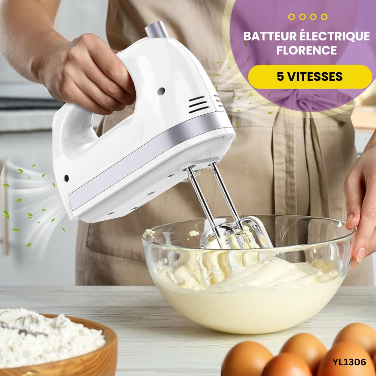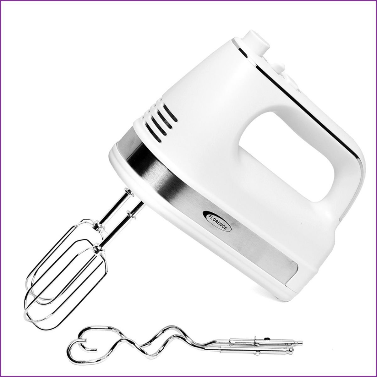 Batteur électrique Florence 200W. 5 vitesses + Turbo. Fouets et crochets à pâte en acier. Parfait pour pétrir et mélanger facilement.