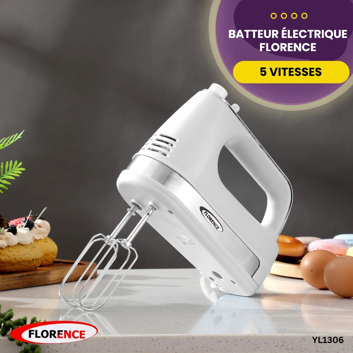 Le Batteur Électrique Florence 200W Blanc (HK406-B) est l'allié parfait pour réaliser gâteaux moelleux, crèmes onctueuses et pâtes à pain réussies sans stress !