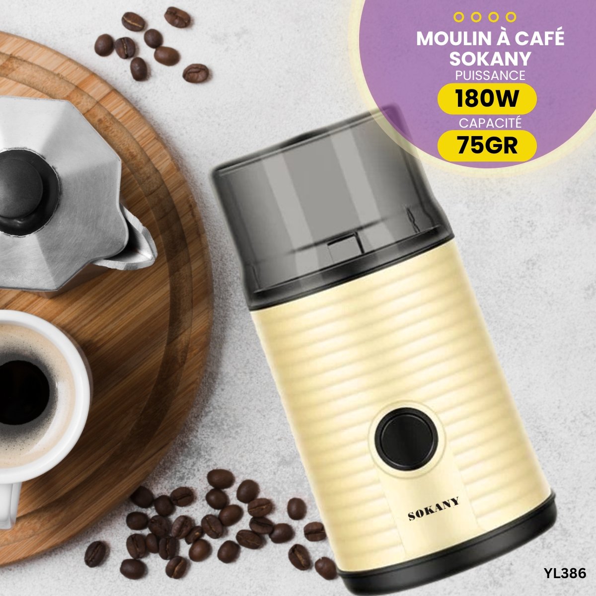 Le moulin SOKANY SK-3018 de 180 watts broie jusqu’à 75 grammes, avec un interrupteur de sécurité, un design élégant, et un broyage facile.