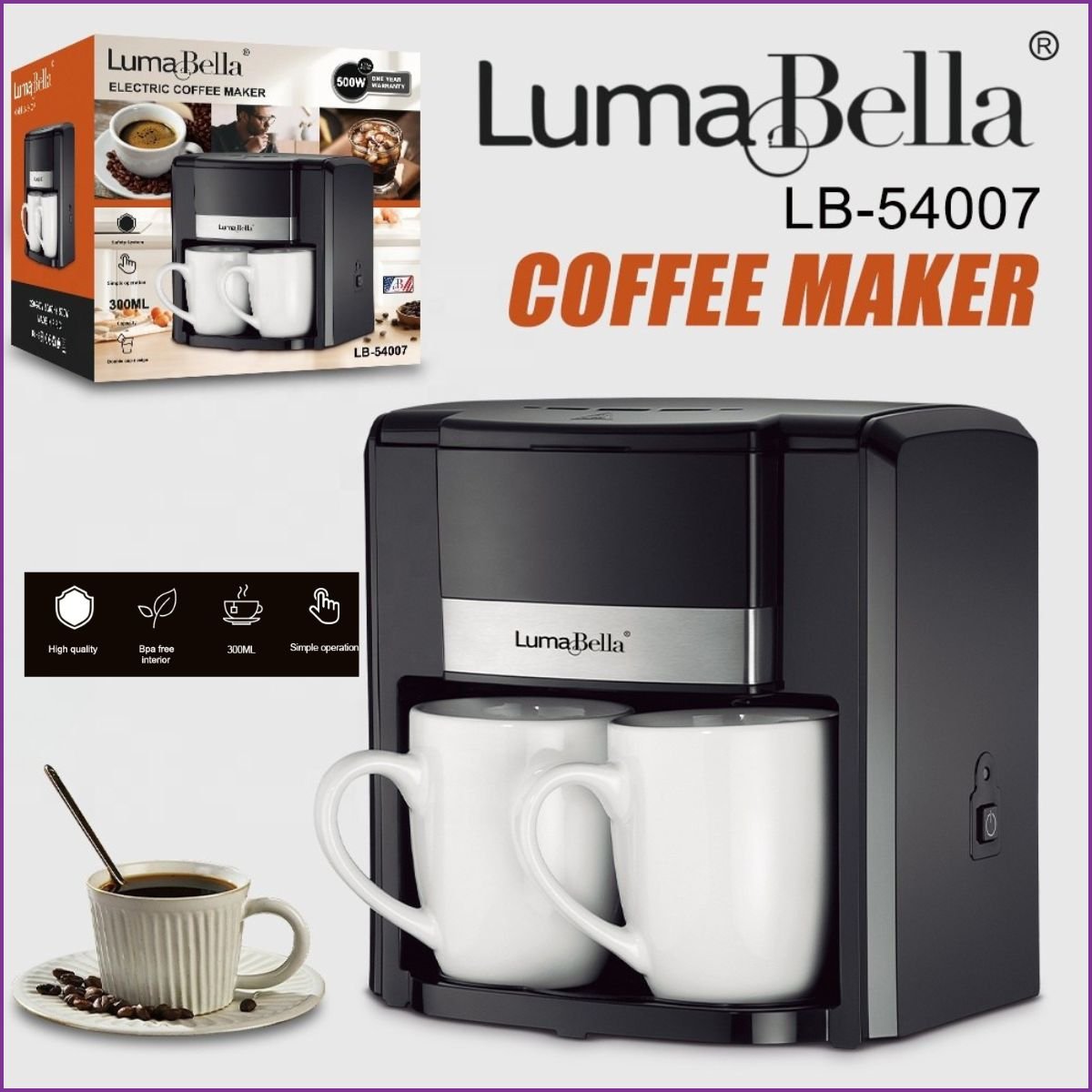 Savourez un café parfait avec la LumaBella LB-54007. Compacte, 500W, sans BPA et livrée avec 2 tasses céramiques. L’essentiel pour un réveil à deux réussi !