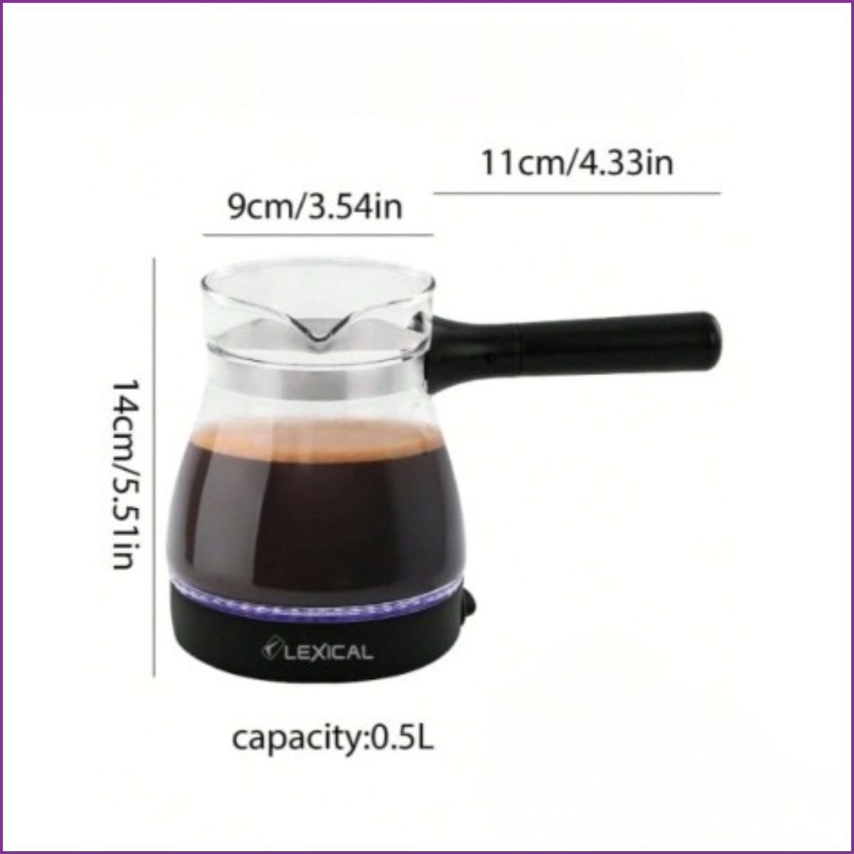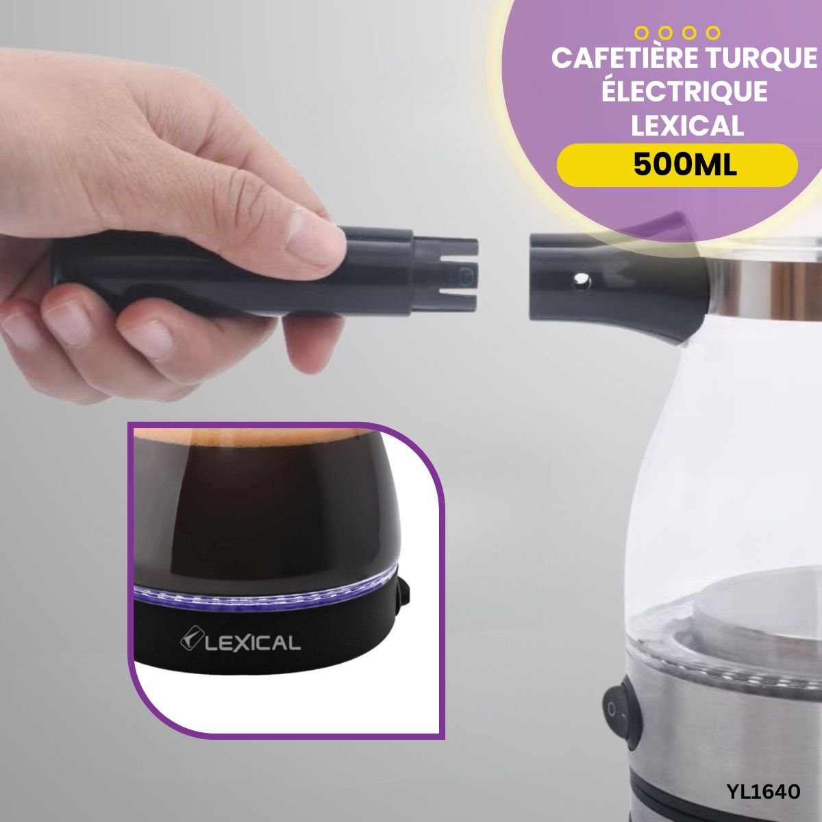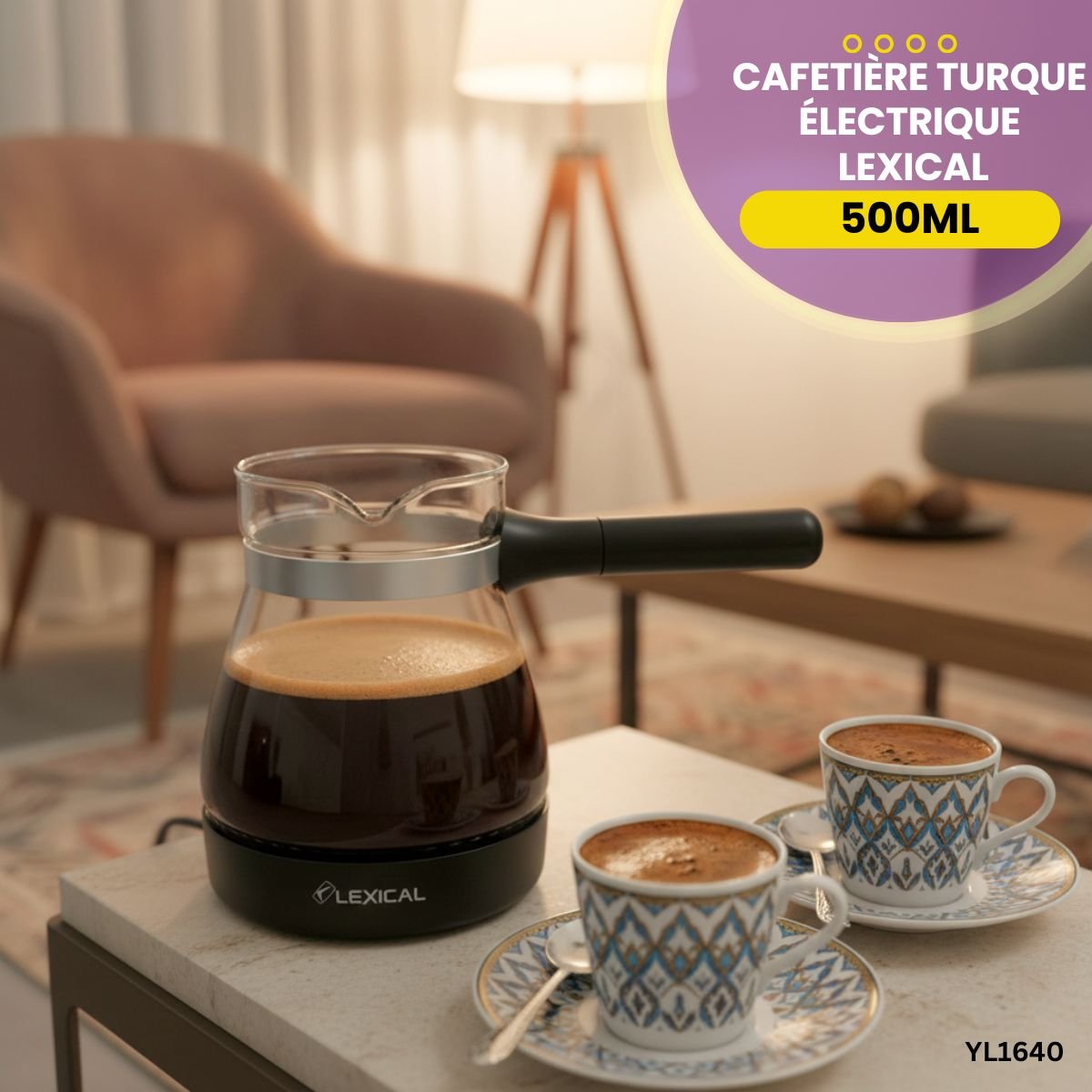 Préparez un café turc authentique et mousseux avec la cafetière Lexical 500W. Design compact 0,5L, chauffe rapide et éclairage LED.