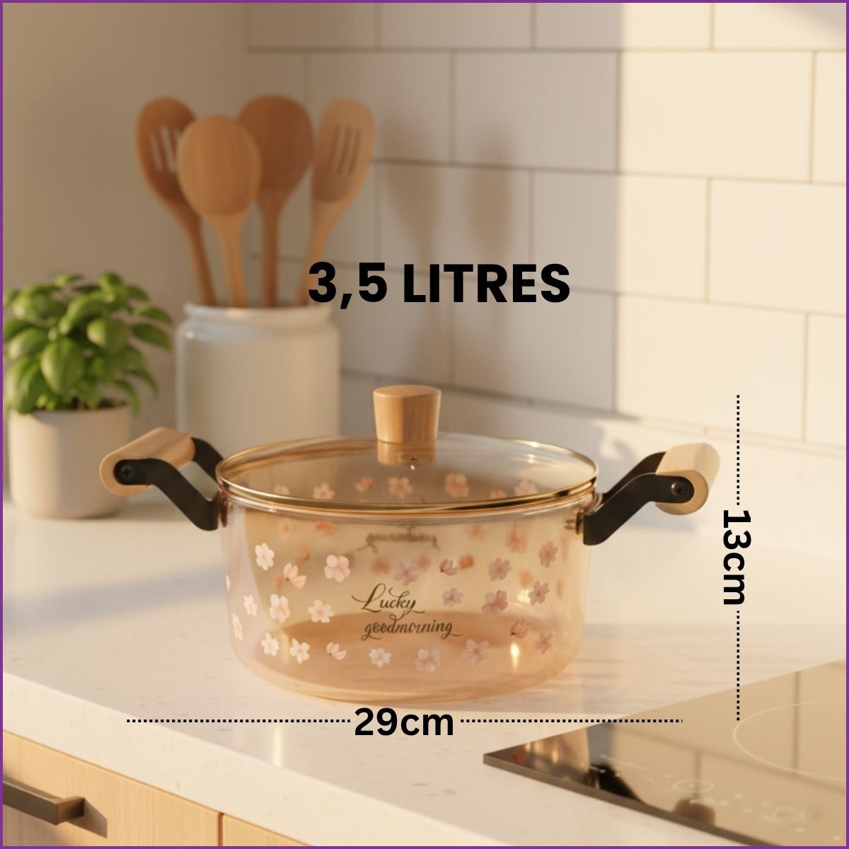 Casserole en verre 3,5L avec couvercle transparent et poignées bois. Design fleuri élégant, idéale pour une cuisson saine et esthétique au quotidien.