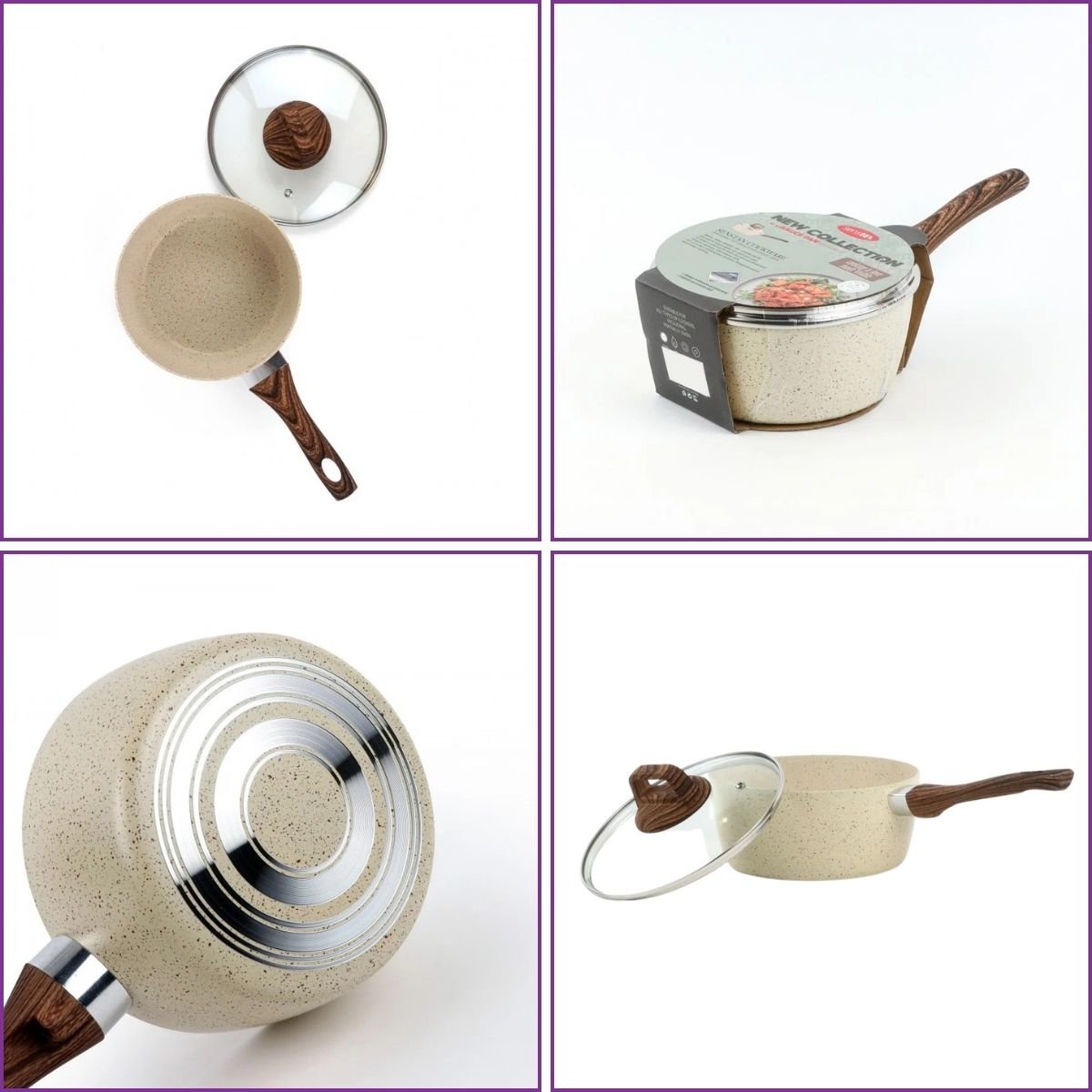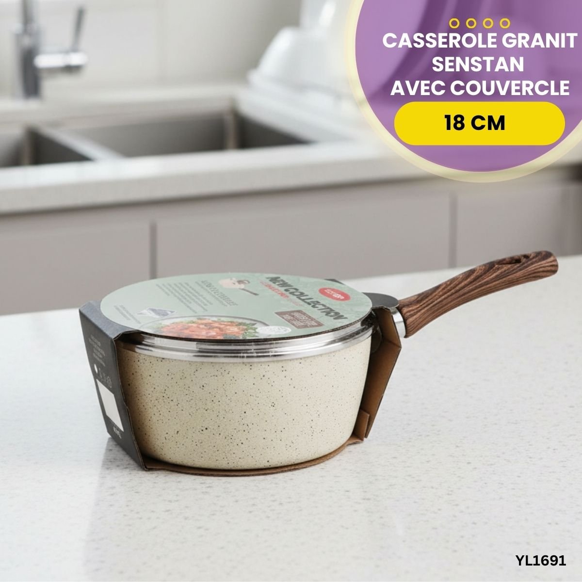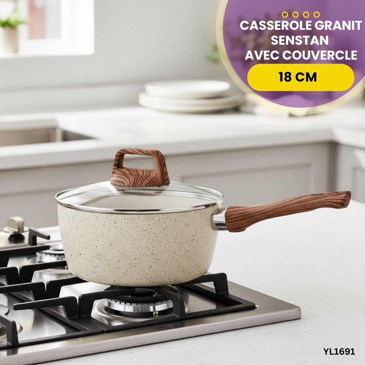 Découvrez la casserole Senstan 18cm. Revêtement granit antiadhésif sans PFOA, couvercle en verre et manche soft-touch effet bois.