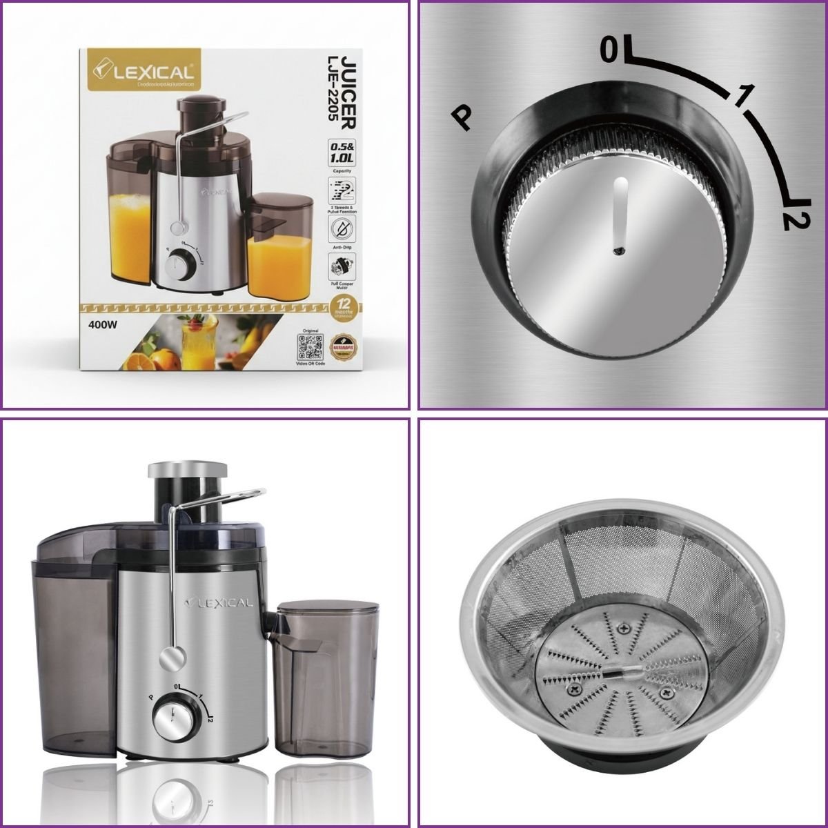 Extraisez le meilleur de vos fruits avec la centrifugeuse Lexical 400W. Boîtier inox, moteur en cuivre et 2 vitesses pour des jus frais et sains au quotidien.