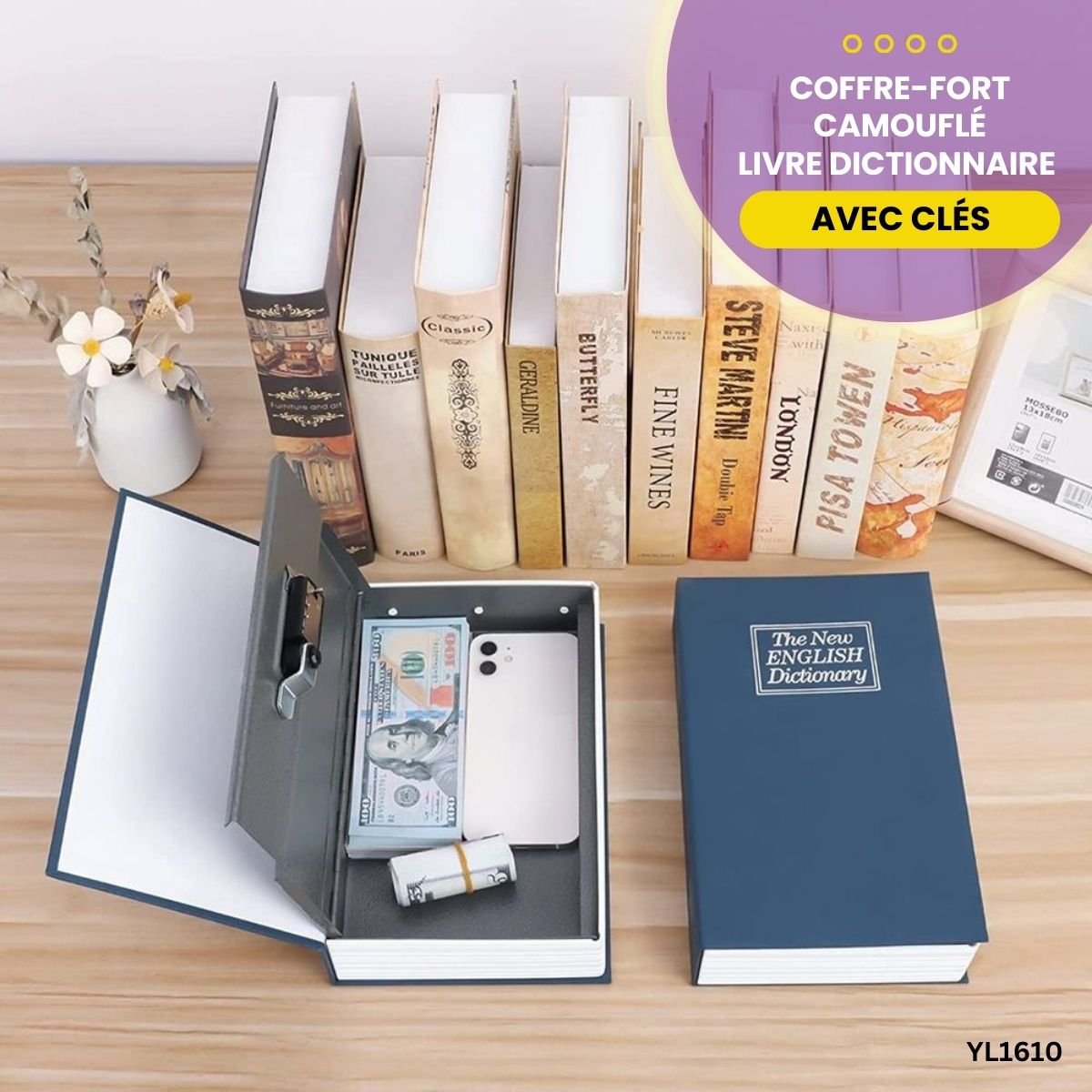 Ne laissez plus vos objets de valeur à la vue de tous. Le coffre-fort en forme de livre est la solution de rangement idéale pour sécuriser vos biens les plus précieux (argent, bijoux, documents confidentiels ou montres). Conçu pour ressembler à s'y méprendre à un dictionnaire anglais classique ("The New English Dictionary"), il se glisse naturellement parmi vos autres livres sur une étagère, le rendant totalement invisible pour un intrus.