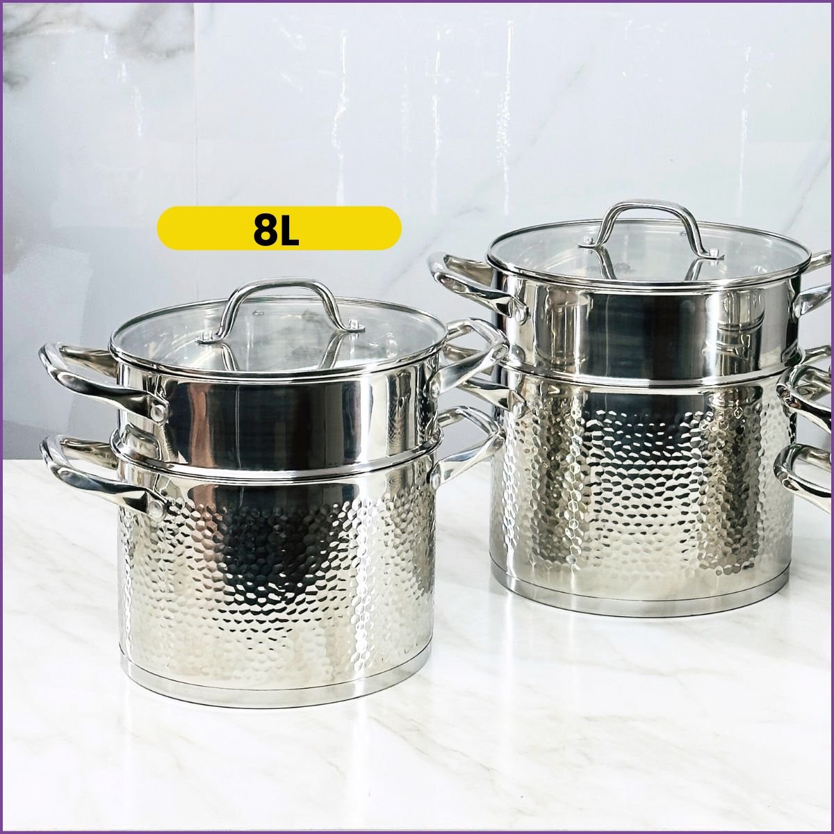Couscoussier en inox martelé d’une capacité de 8 L. Idéal pour la cuisson vapeur saine du couscous et des légumes. Design élégant et durable.