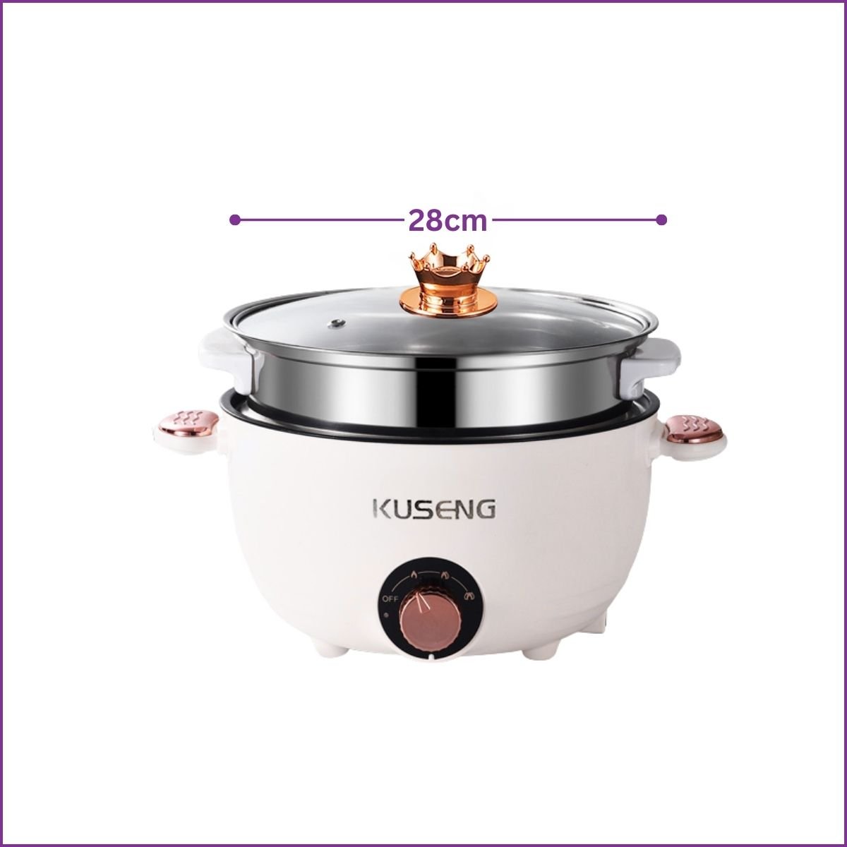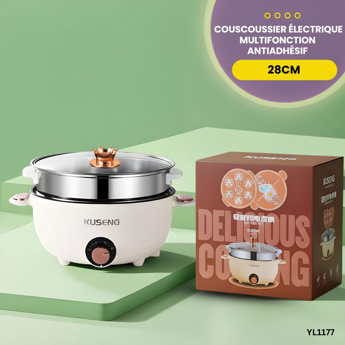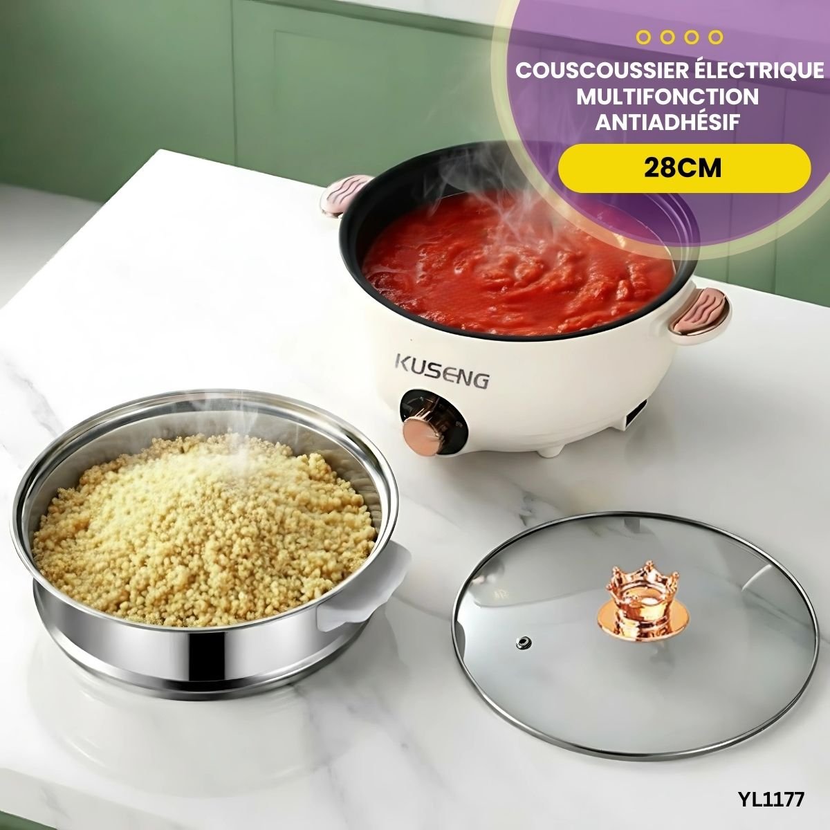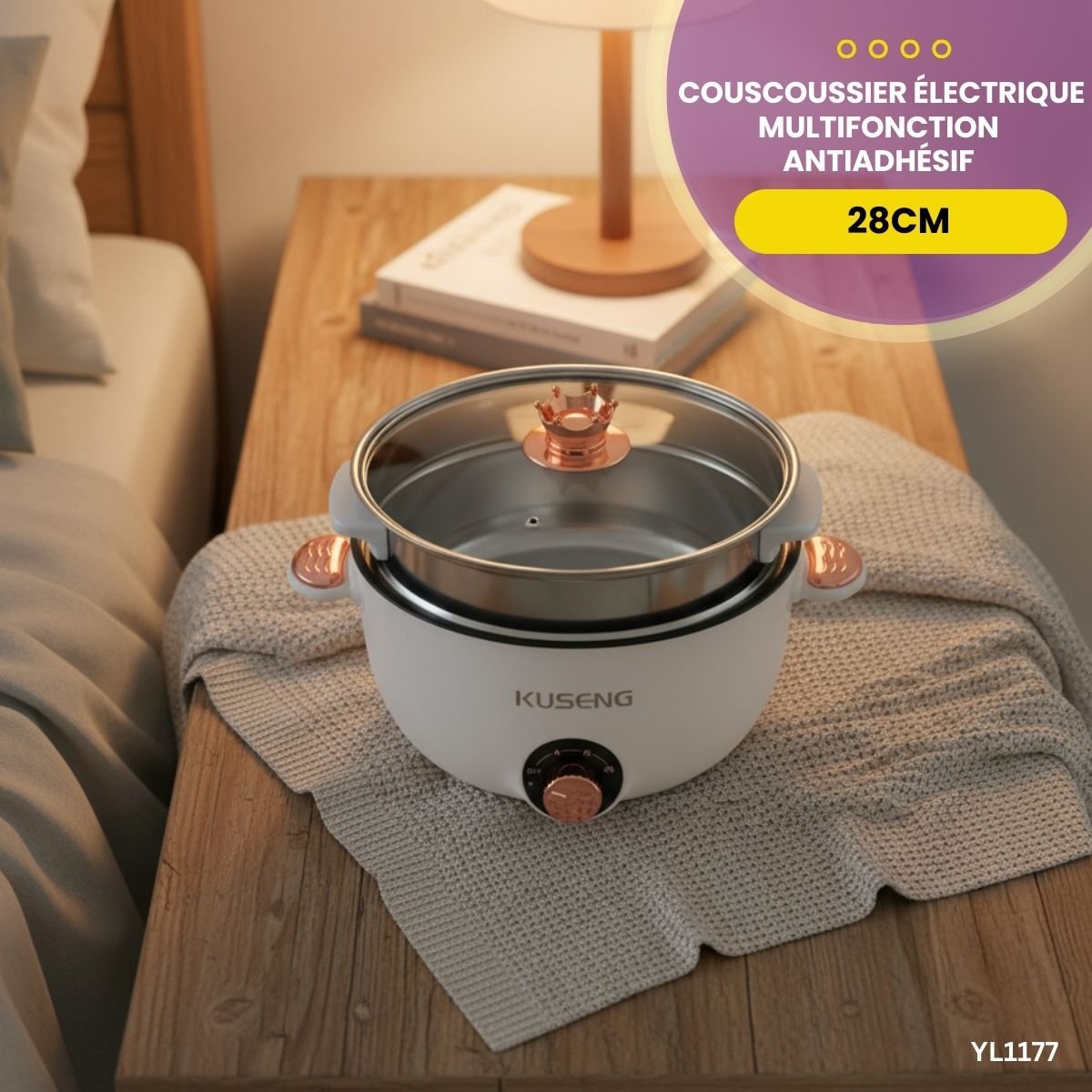 Couscoussier électrique 28cm KUSENG antiadhésif et multifonction. Idéal pour riz, vapeur, et plats mijotés. Parfait pour étudiants et familles.