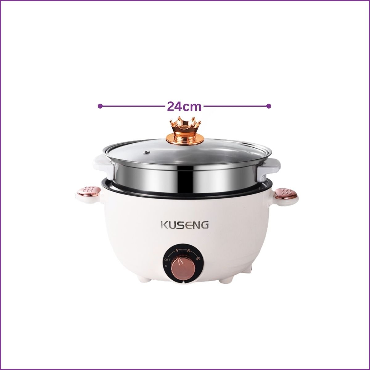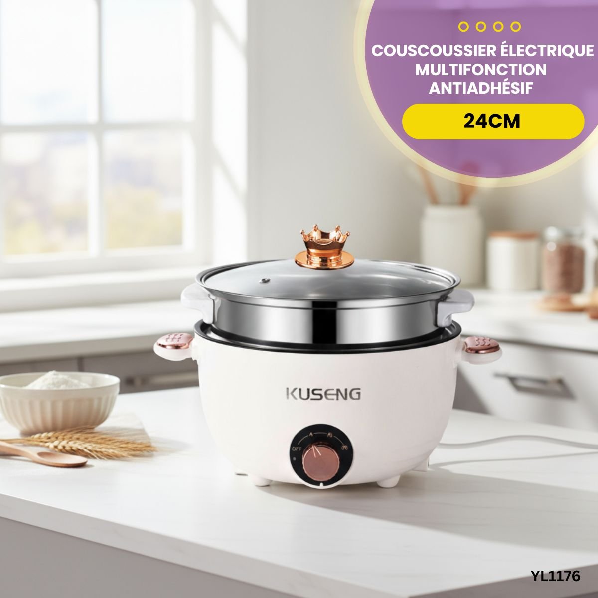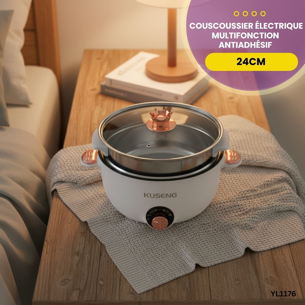 Couscoussier électrique 24cm KUSENG antiadhésif et multifonction. Idéal pour riz, vapeur, et plats mijotés. Parfait pour étudiants et familles.