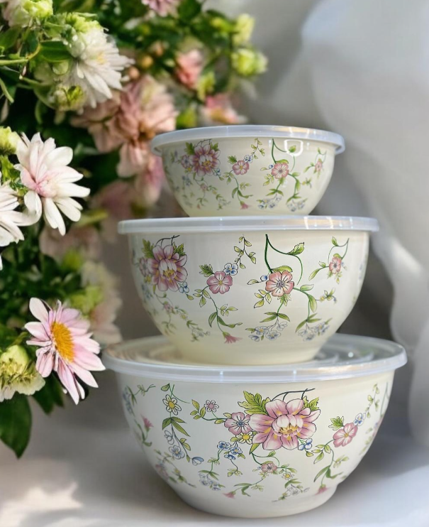 Le design floral délicatement imprimé sur chaque bol apporte une touche de charme rétro à votre cuisine. Par ailleurs, leurs dimensions pratiques (16 cm, 22 cm, 26 cm) les rendent polyvalents : préparation, service, conservation ou transport, tout est possible !