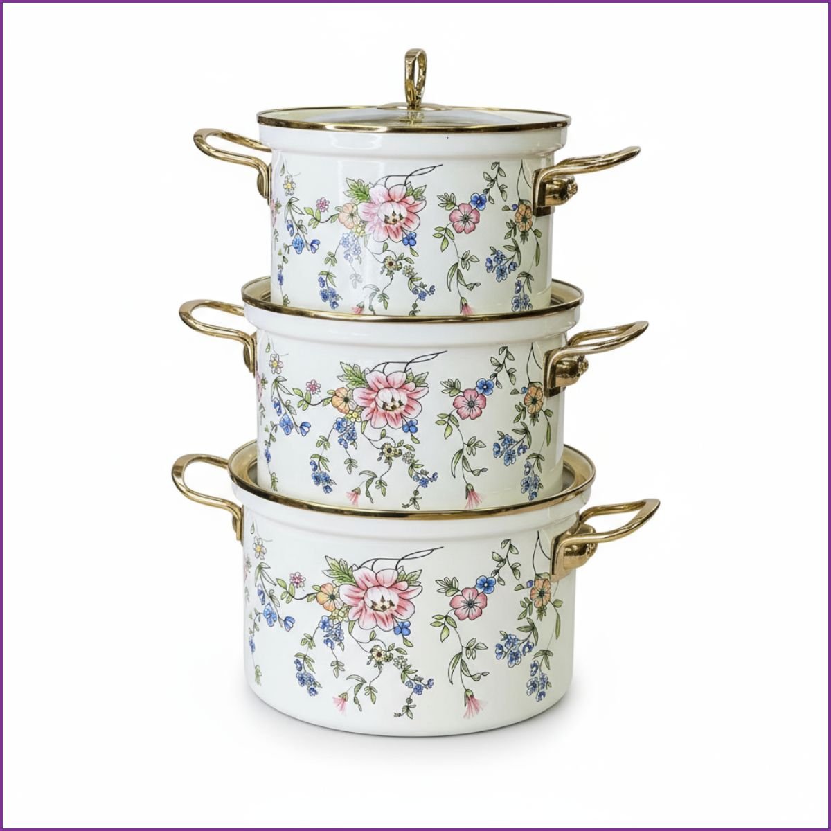 Ensemble de casseroles fleuries en émail 3 pièces (20/22/24 cm) avec couvercles. Compatibles tous feux, design élégant, nettoyage facile.