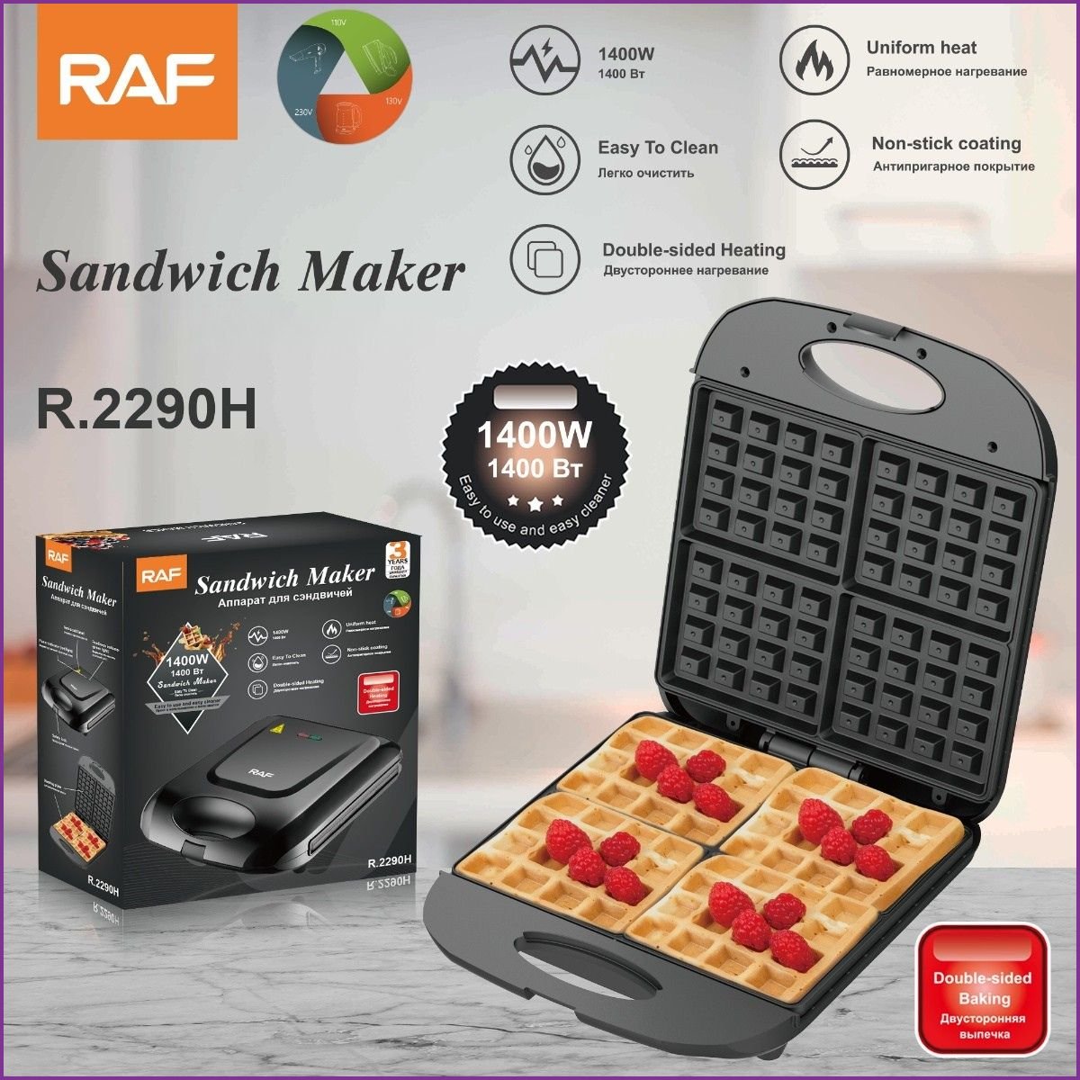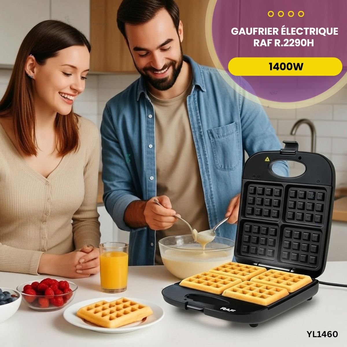 Gaufrier RAF 1400W pour 4 gaufres simultanées. Chauffe double face uniforme, revêtement antiadhésif facile à nettoyer et design moderne.