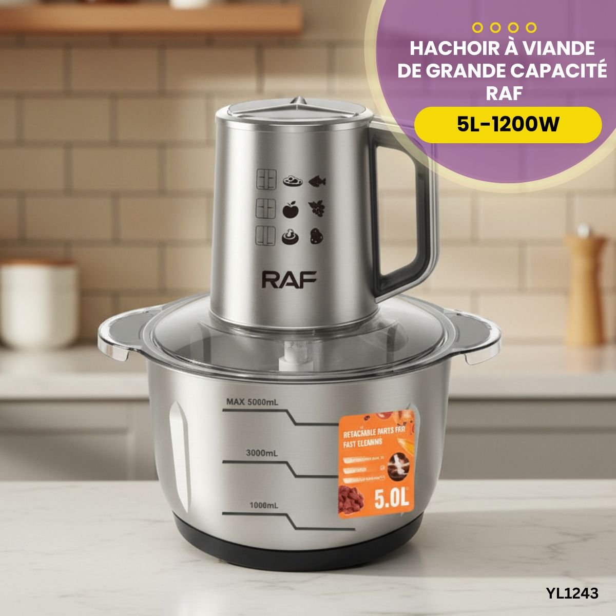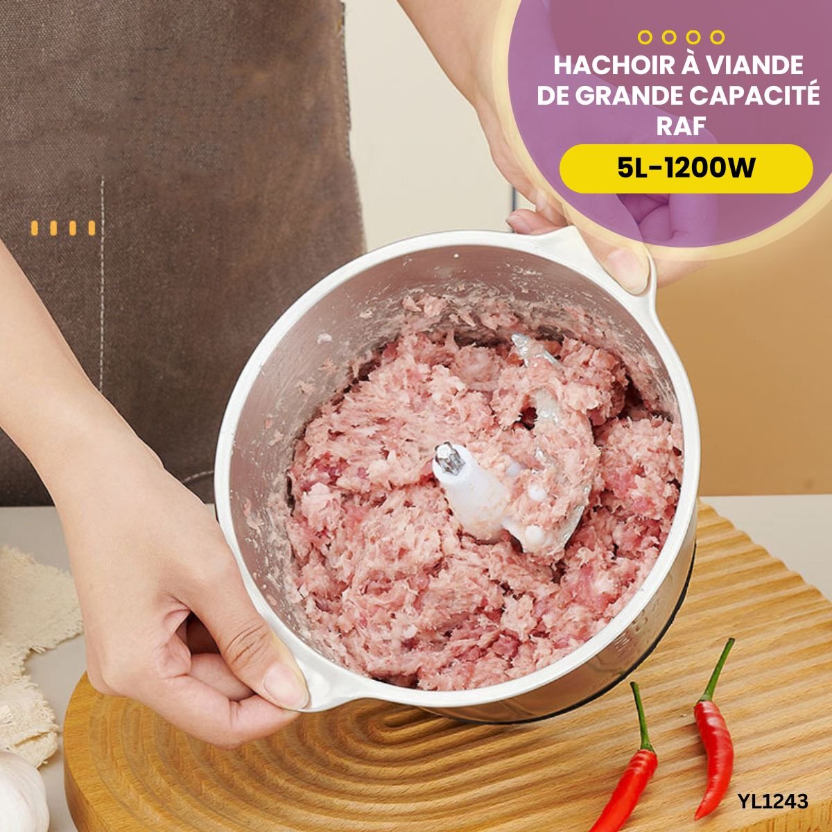 Hachoir électrique RAF 5L – 1200W. Puissant, rapide et multifonction pour hacher viandes, légumes et fruits. Bol inox grande capacité. Idéal cuisine familiale.