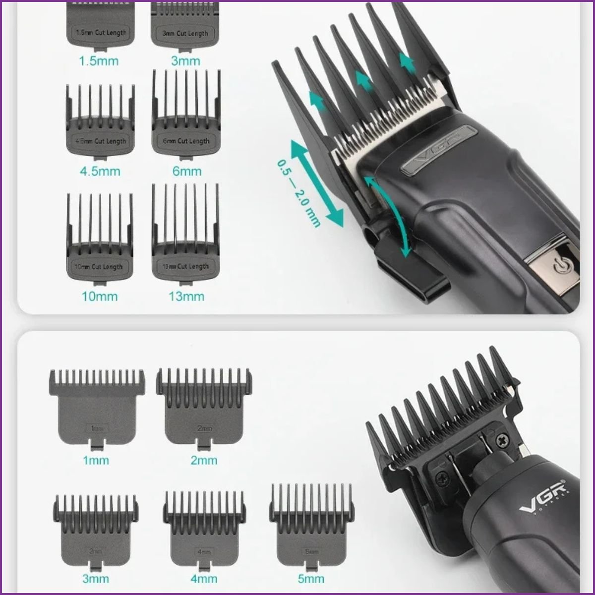 - Guides de Coupe Étendus : 6 peignes de guidage (1,5 - 3 - 4,5 - 6 - 10 - 13 mm).