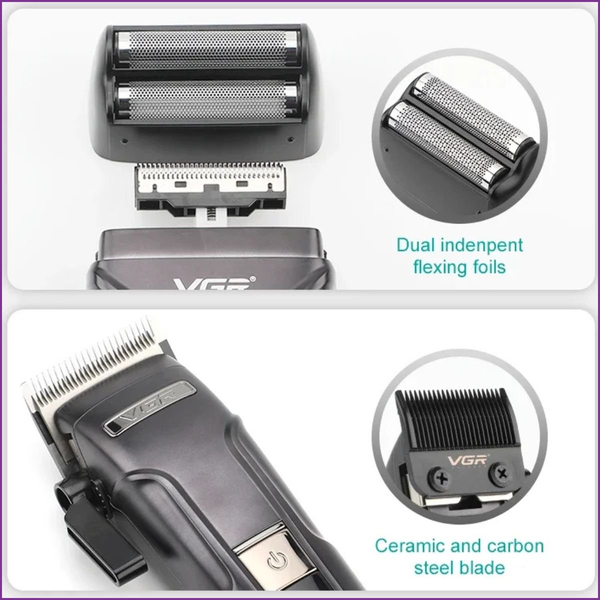 Kit Professionnel VGR V-694 (3-en-1 : Tondeuse, Finition, Rasoir). Tondeuse : Lames Céramique/Carbone. Moteurs puissants (jusqu’à 7500 RPM).