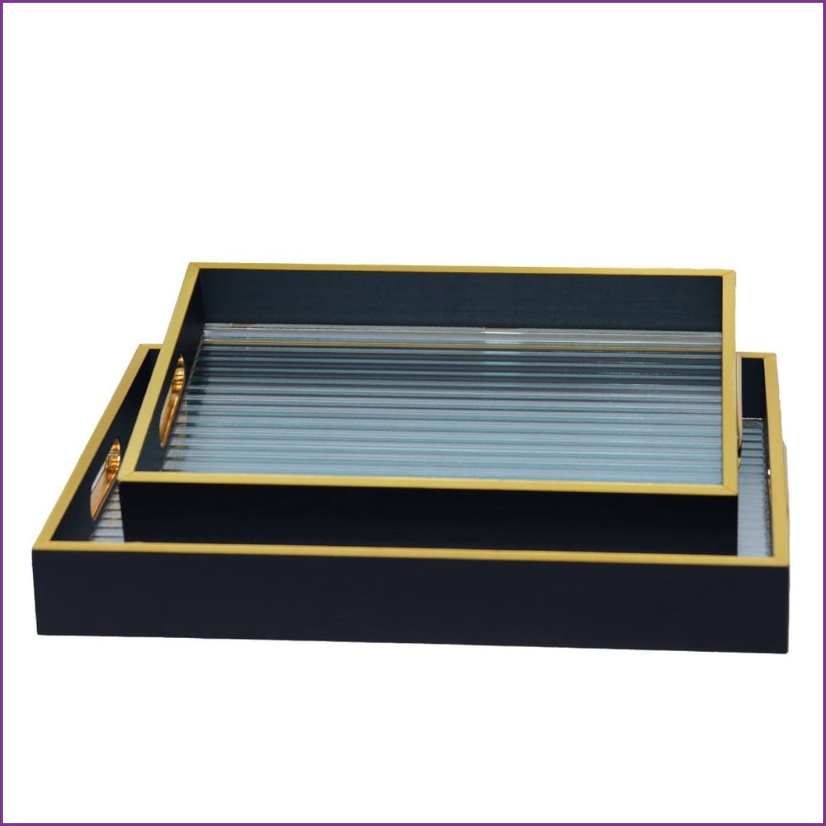 Chaque plateau présente une structure en bois noir mat rehaussée par des bordures dorées luxueuses. Le fond en plexiglas à l'aspect "verre martelé" crée un jeu de lumière fascinant, idéal pour mettre en valeur vos verres, amuse-bouches ou même vos objets de décoration sur une table basse.