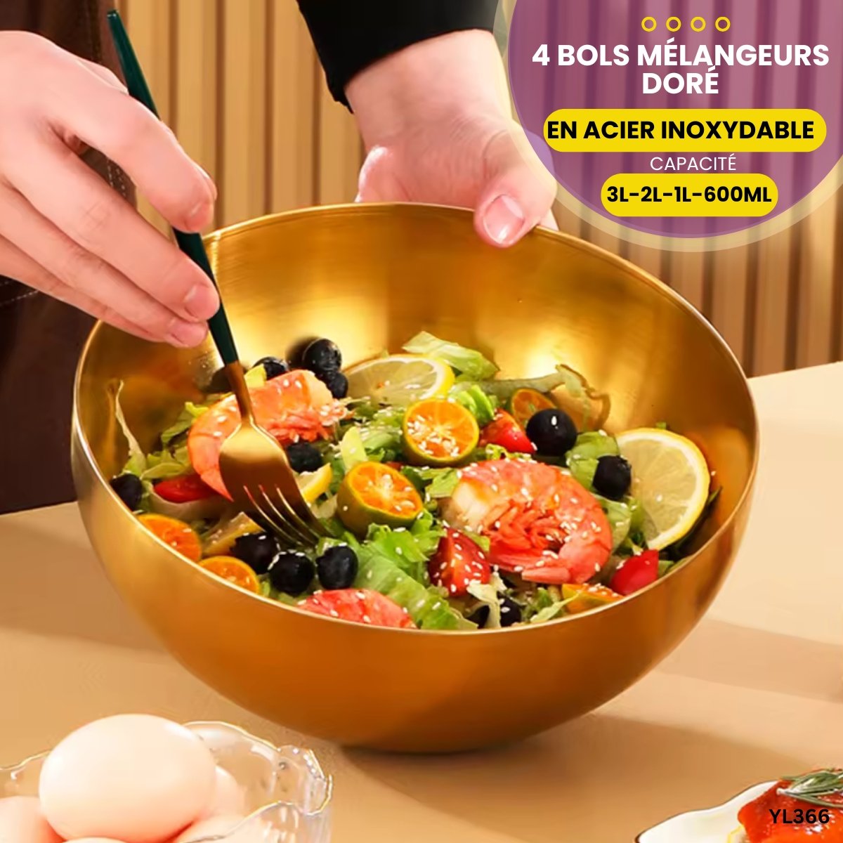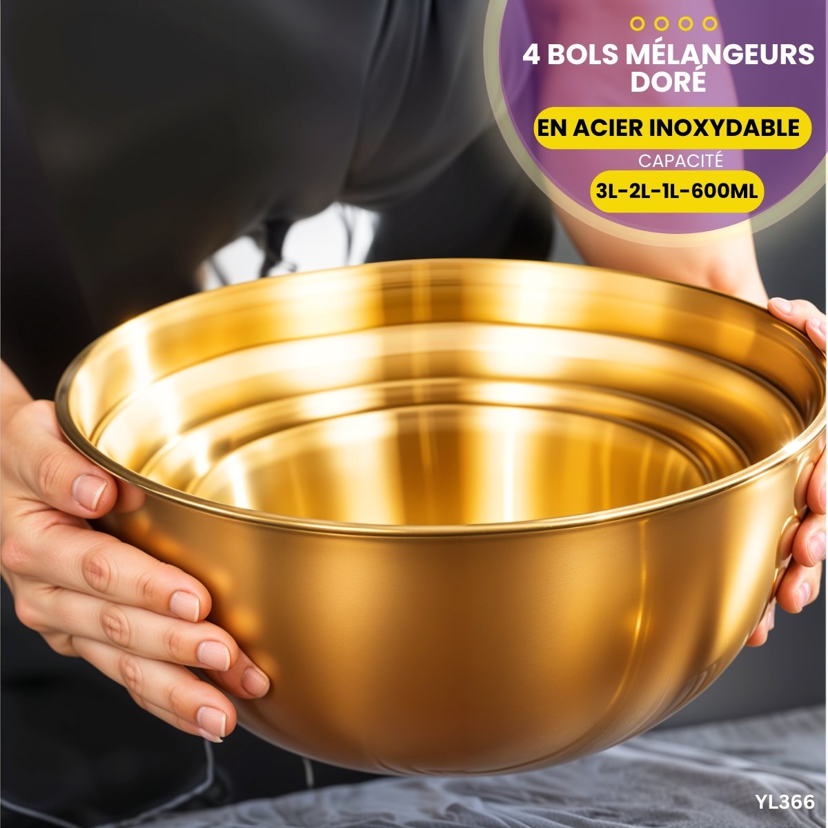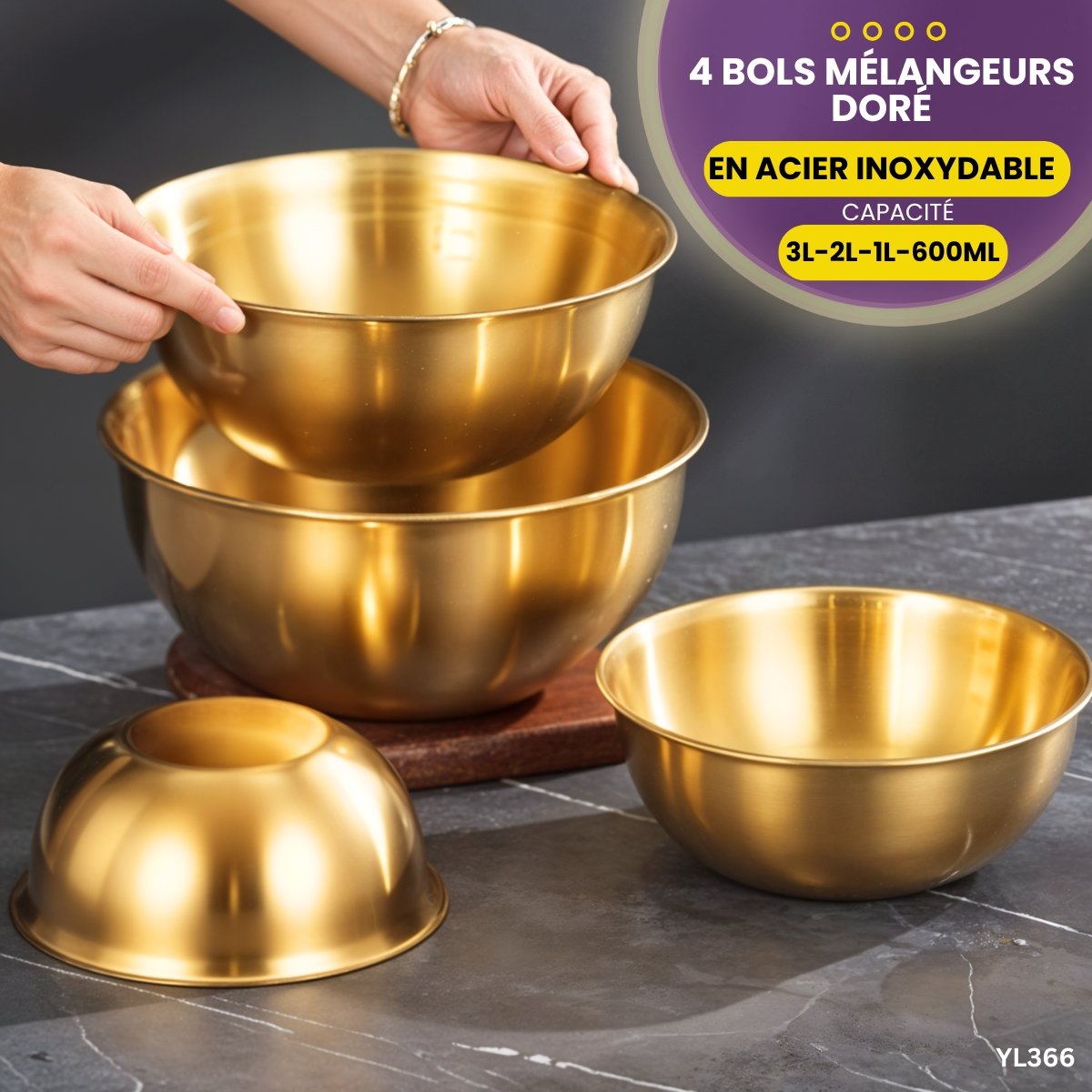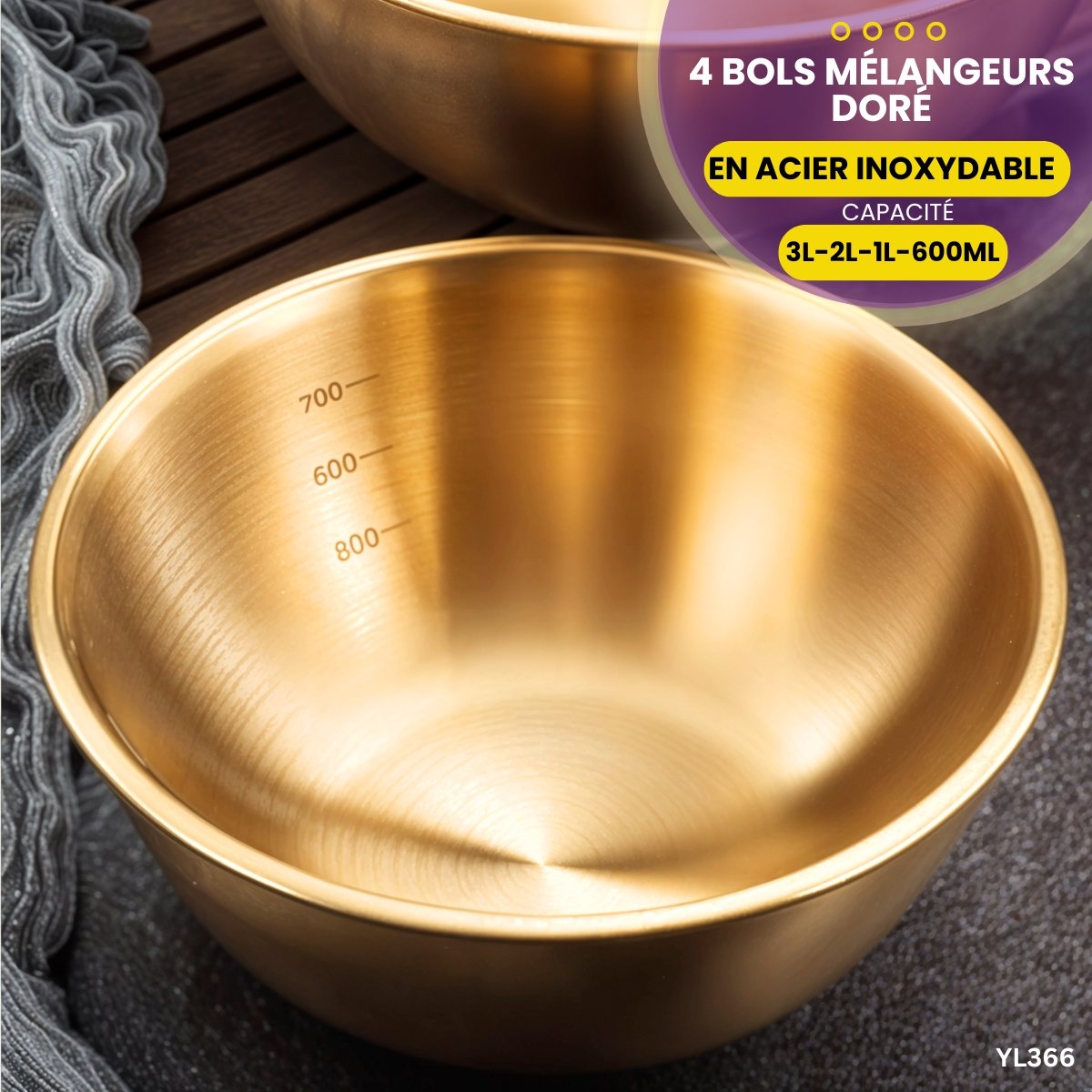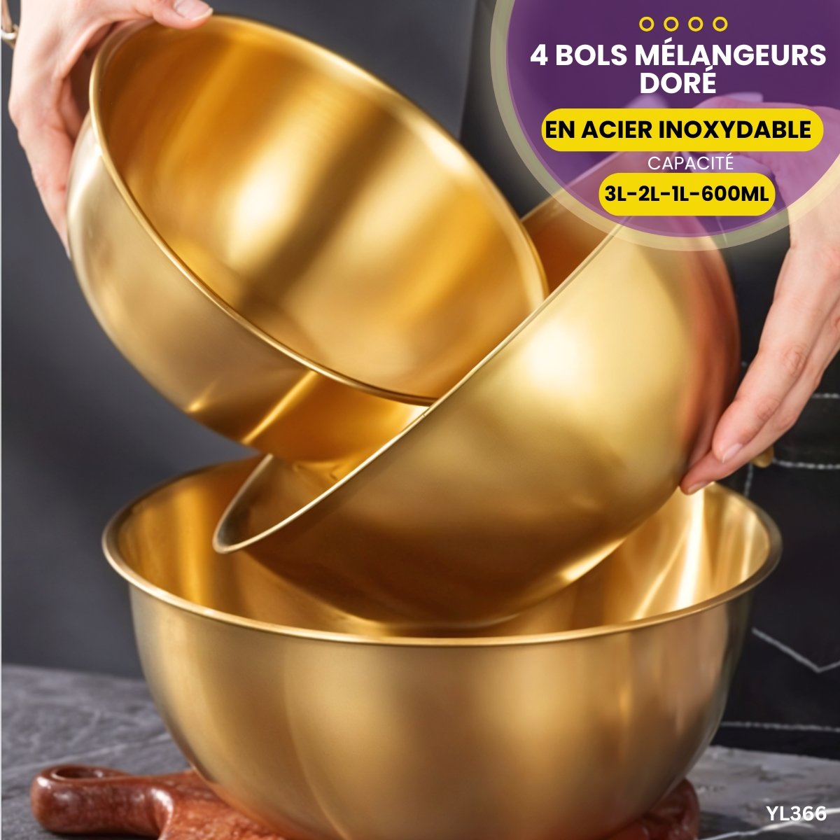 Ensemble de 4 pièces : bol de mélange en acier inoxydable doré .