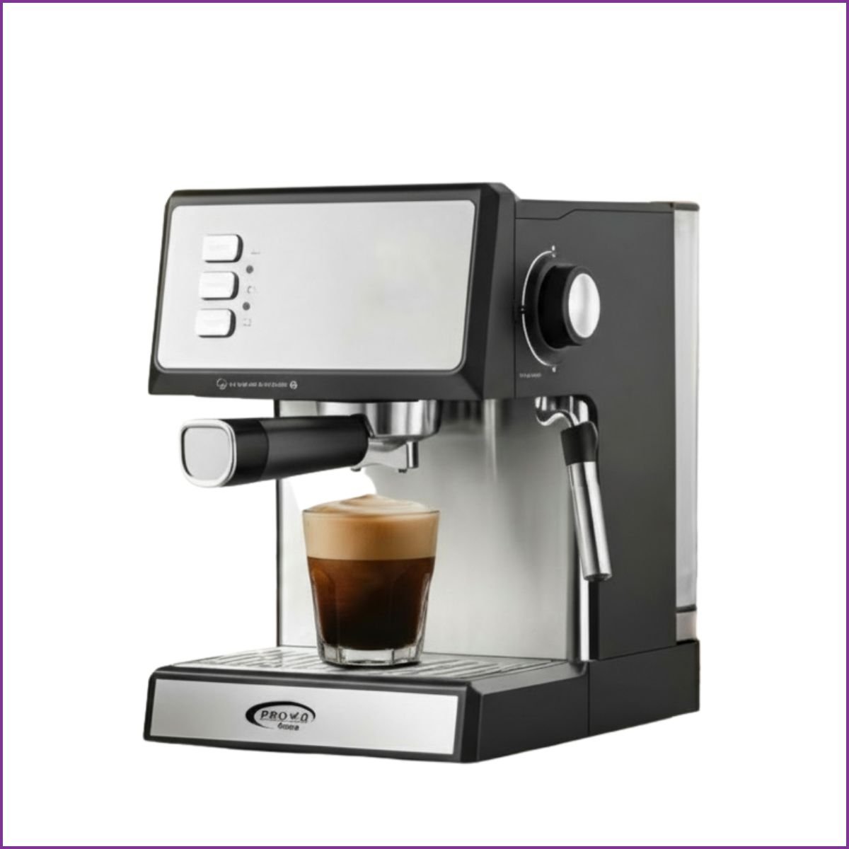 La machine à café PROVA 850W permet de préparer espresso, cappuccino ou latte à la maison. Réservoir 1,8 L, buse vapeur, chauffe rapide et design élégant.