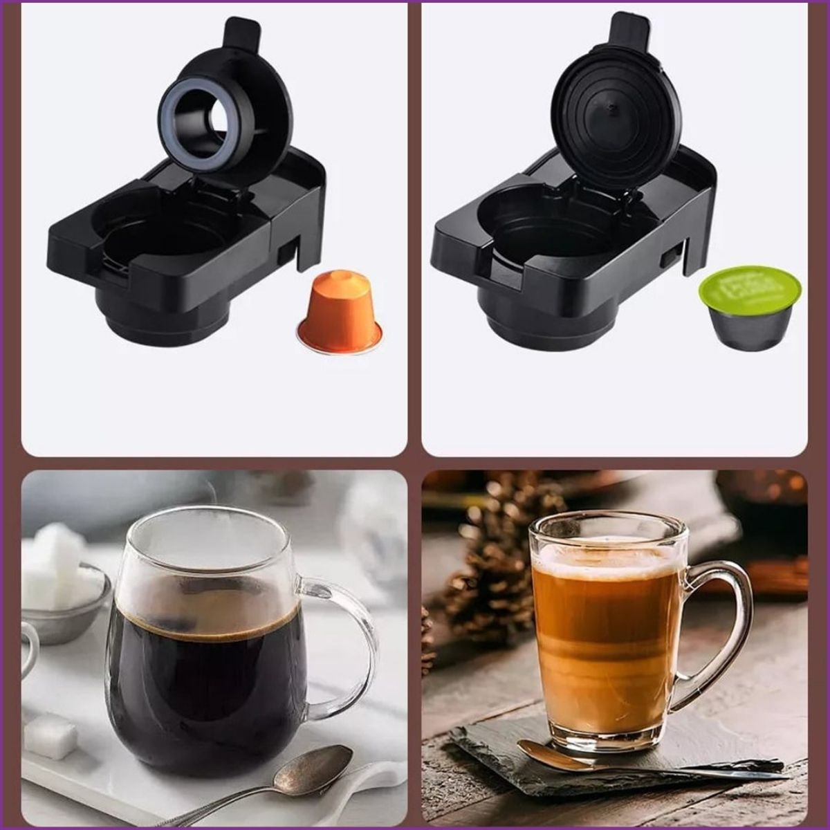 Grâce à ses quatre adaptateurs inclus, passez instantanément du mode capsule au mode café moulu :