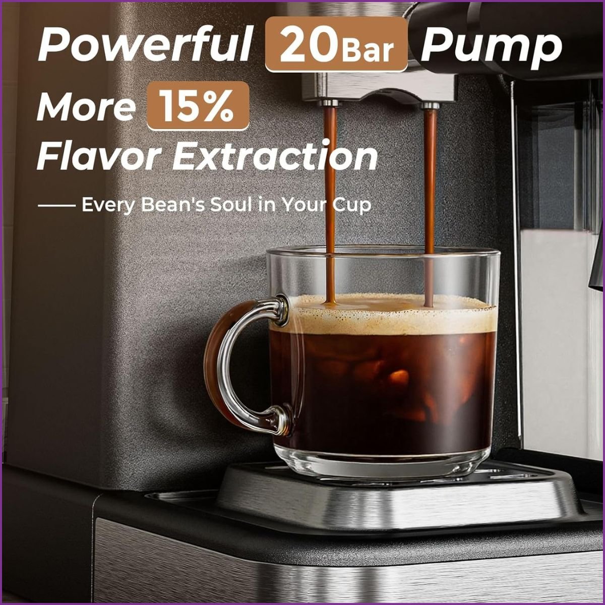 Grâce à sa puissance de 1350W et sa pompe haute performance de 20 Bars, elle garantit une chauffe ultra-rapide et une extraction parfaite. Par conséquent, vous obtenez une crème riche, une intensité optimale et le goût professionnel que vous méritez, chaque matin.