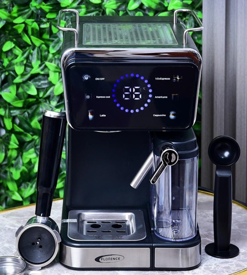Machine Expresso 5en1 Florence. 20 Bars, 1350W. Café moulu/Capsules. Latte, Cappuccino (réservoir lait intégré). Écran LED et Buse vapeur.