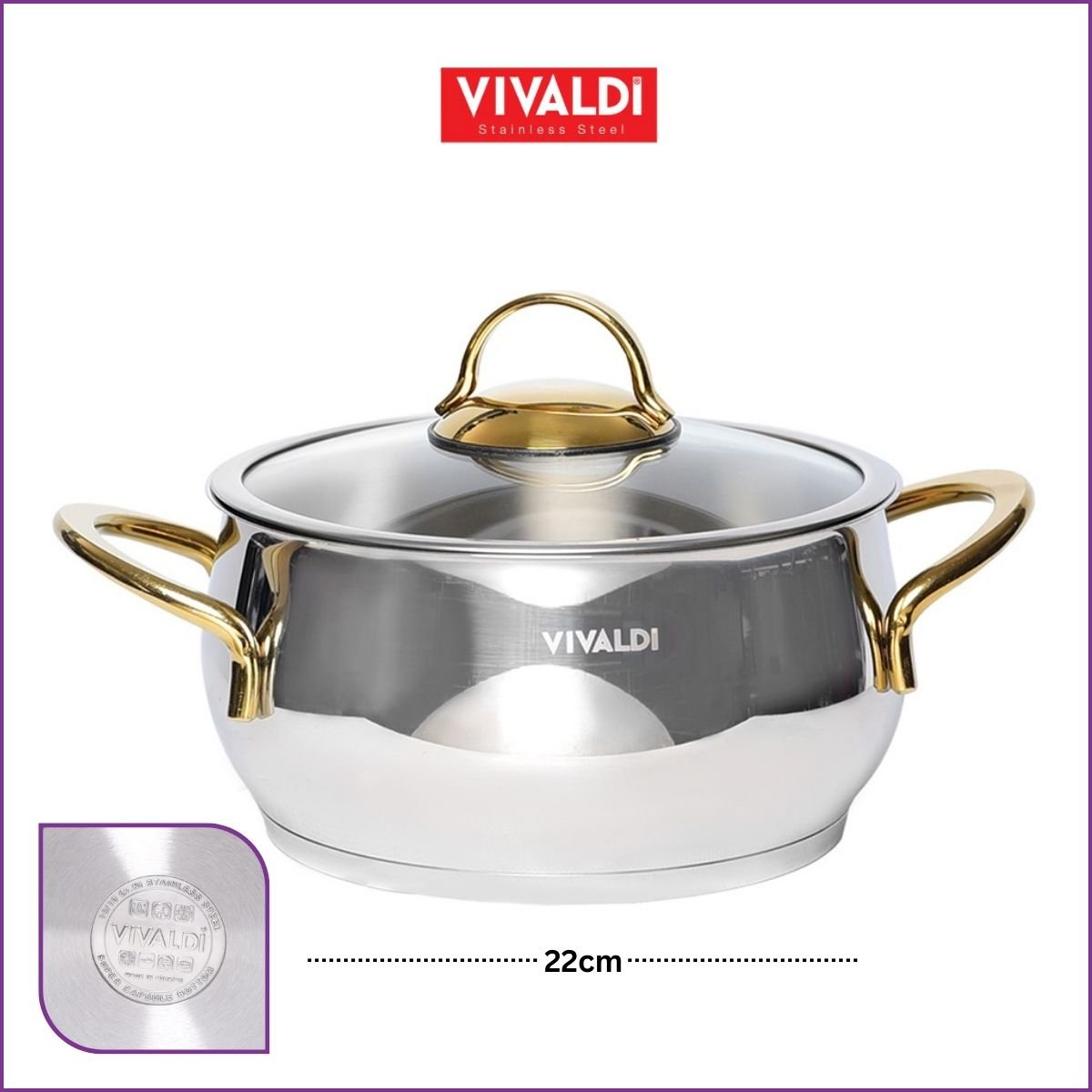 Découvrez la marmite Vivaldi Tombo 22 cm en inox 18/10. Fond capsule pour une cuisson homogène, design élégant avec poignées dorées et couvercle en verre.
