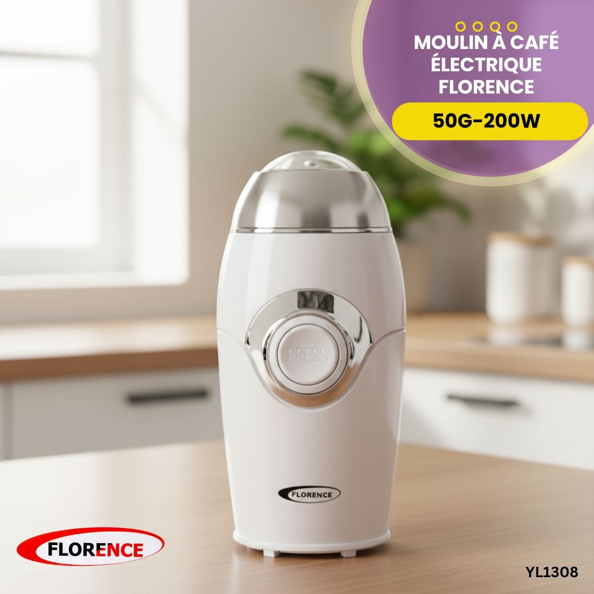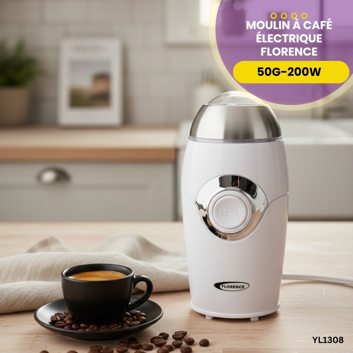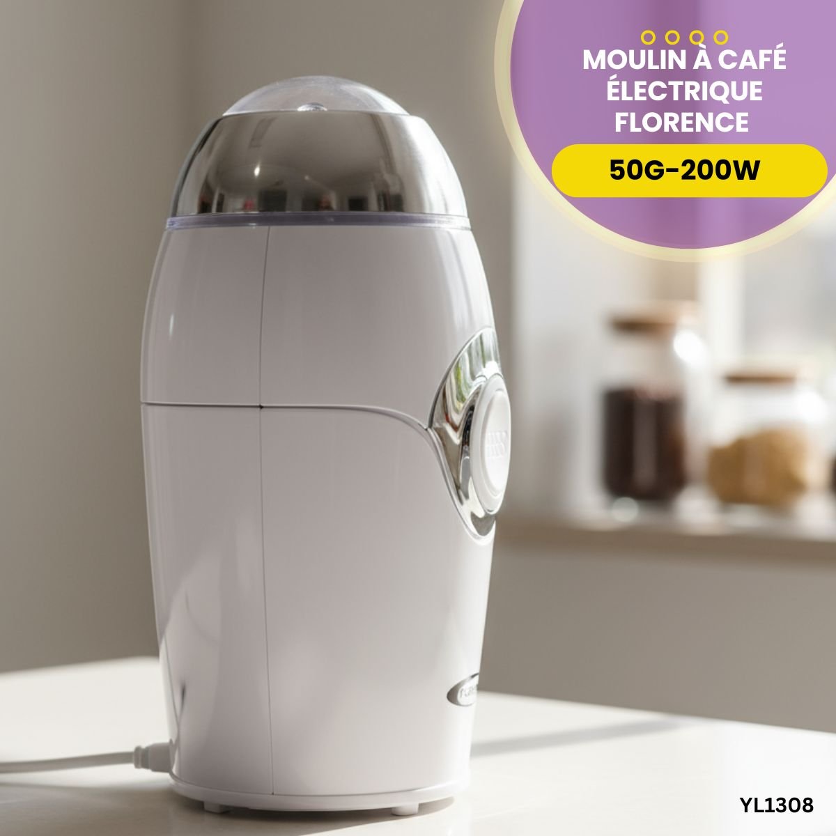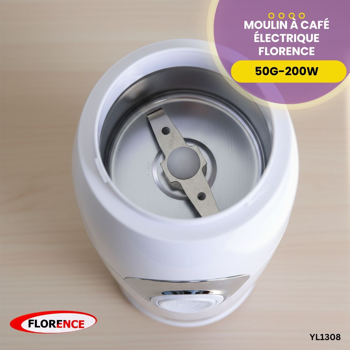 Moulin à café Florence 200W. Moteur cuivre pur. Bol/lames inox. Capacité 50g. Sécurité couvercle. Café fraîchement moulu !