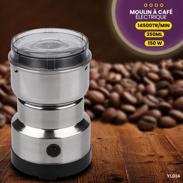Moulin électrique en acier inoxydable de 150W, 14500 RPM, capacité 350ml, parfait pour moudre café et épices avec une performance homogène.