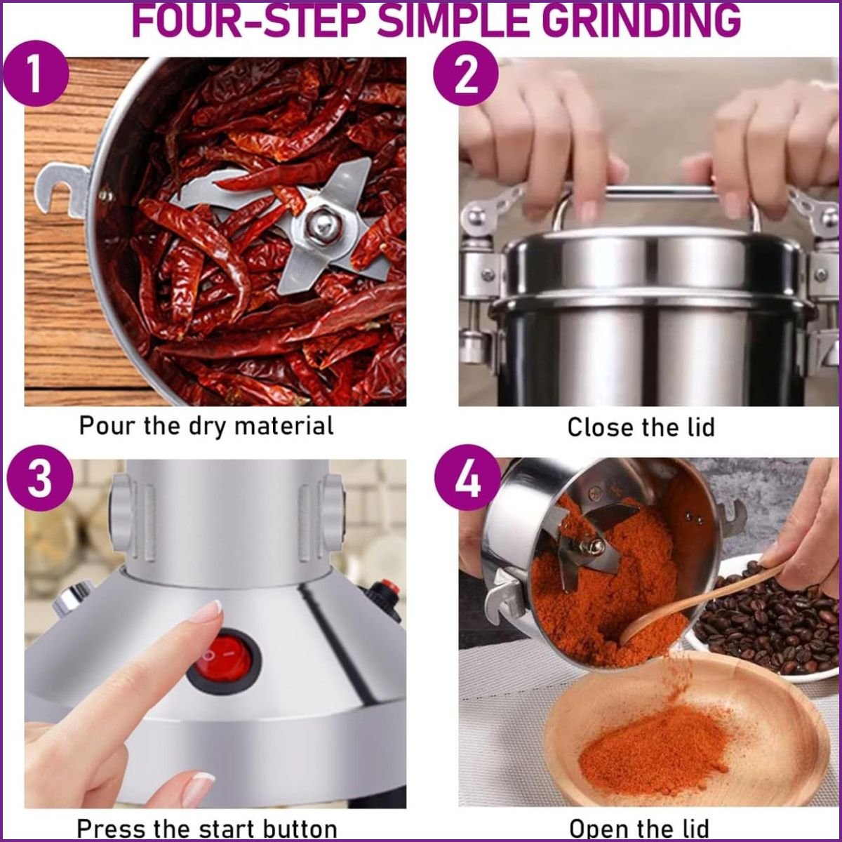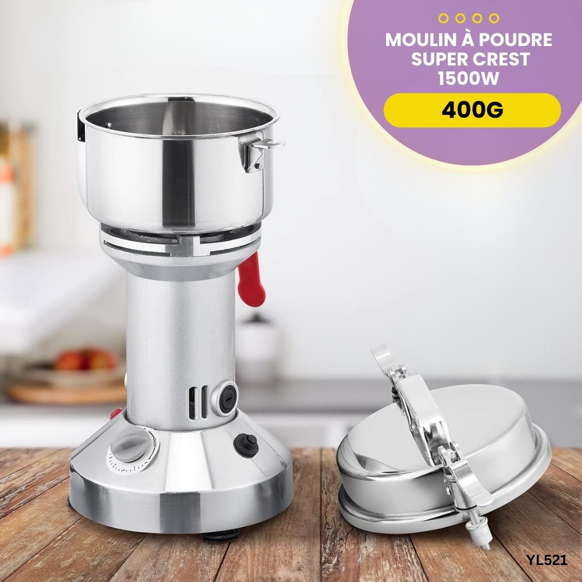 Moulin à Poudre Super Crest (400g – 800g /1500W) en acier inoxydable offre un broyage efficace, avec sécurité et réglage du meulage pour des résultats optimaux.