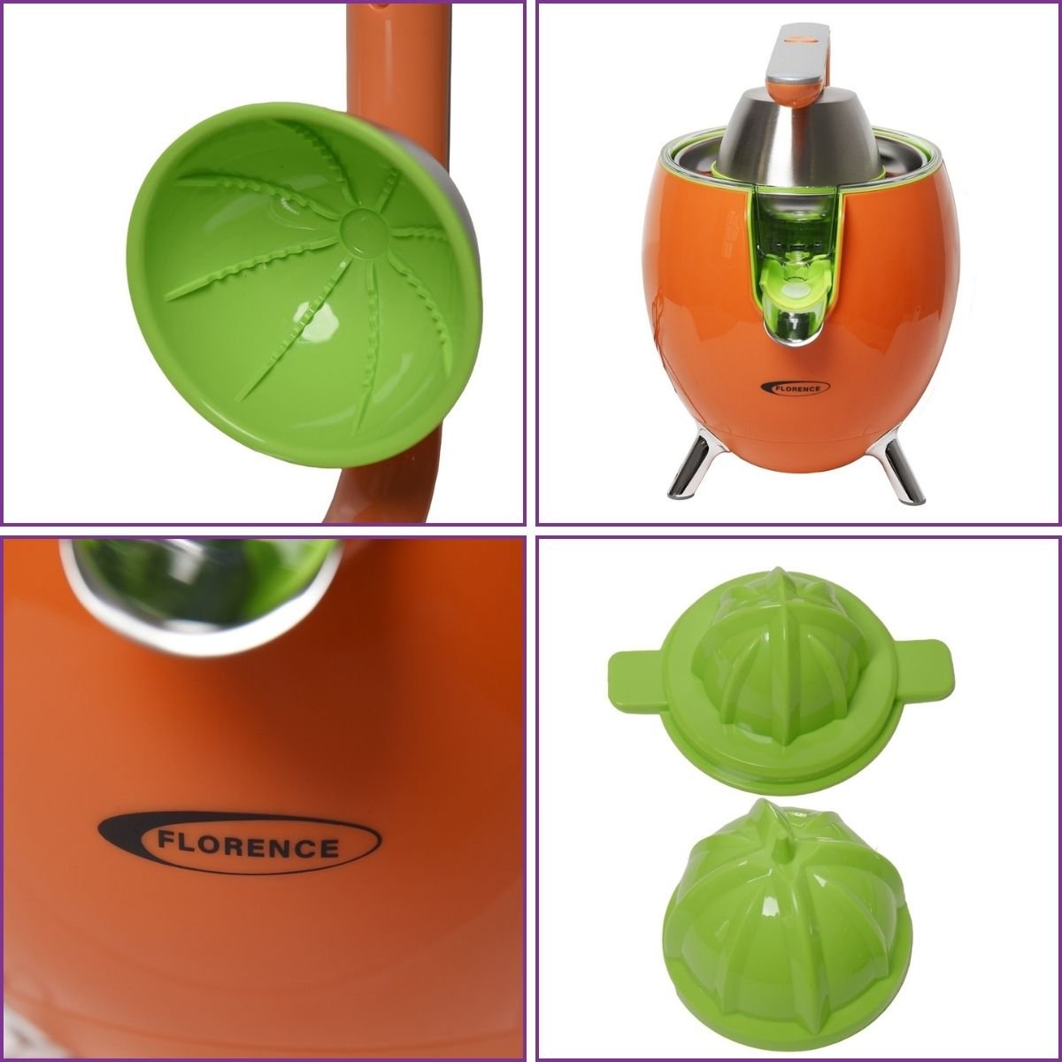 Presse Agrume Florence 450W Orange. Extraction puissante et rapide pour jus frais. Cône universel, anti-gouttes. Nettoyage facile.