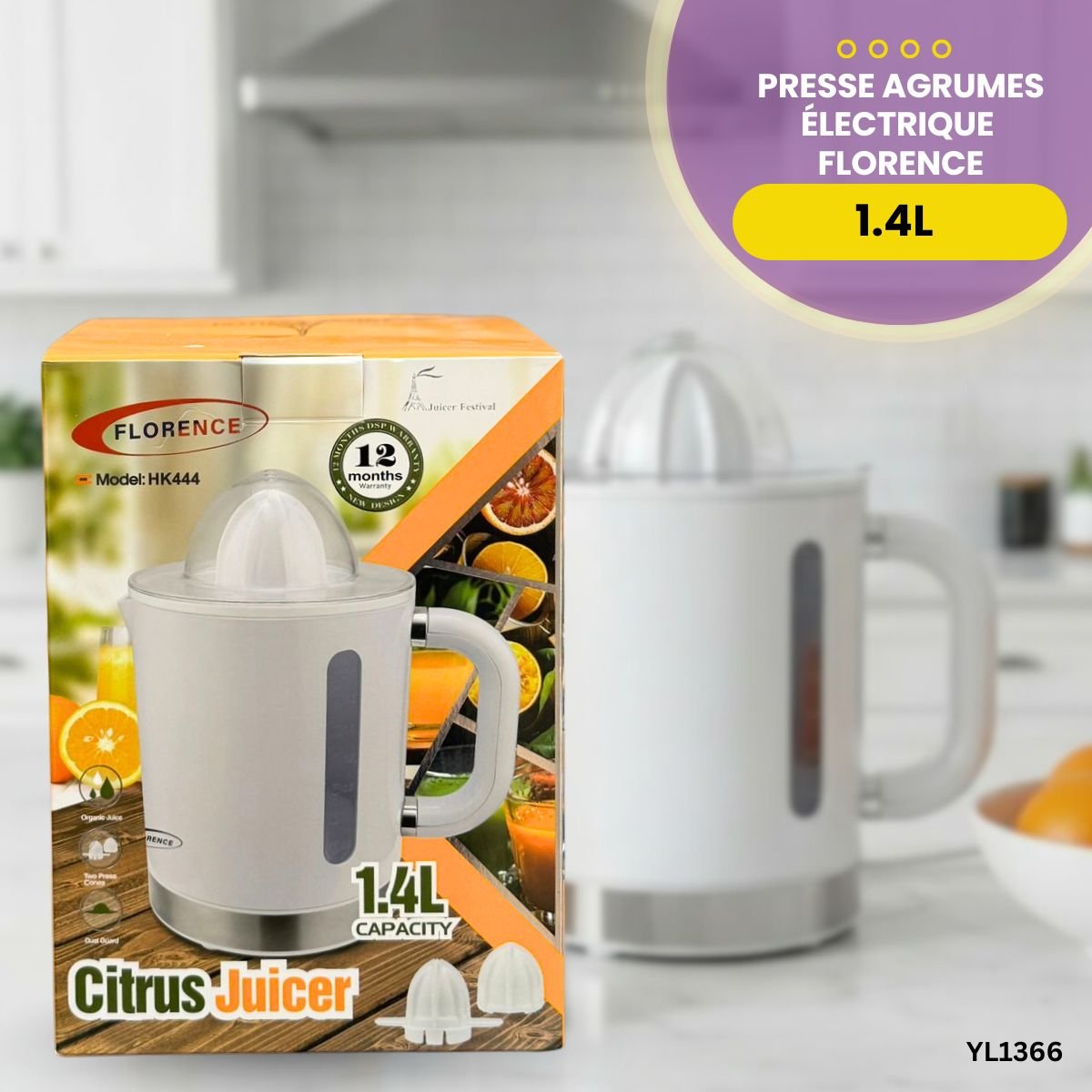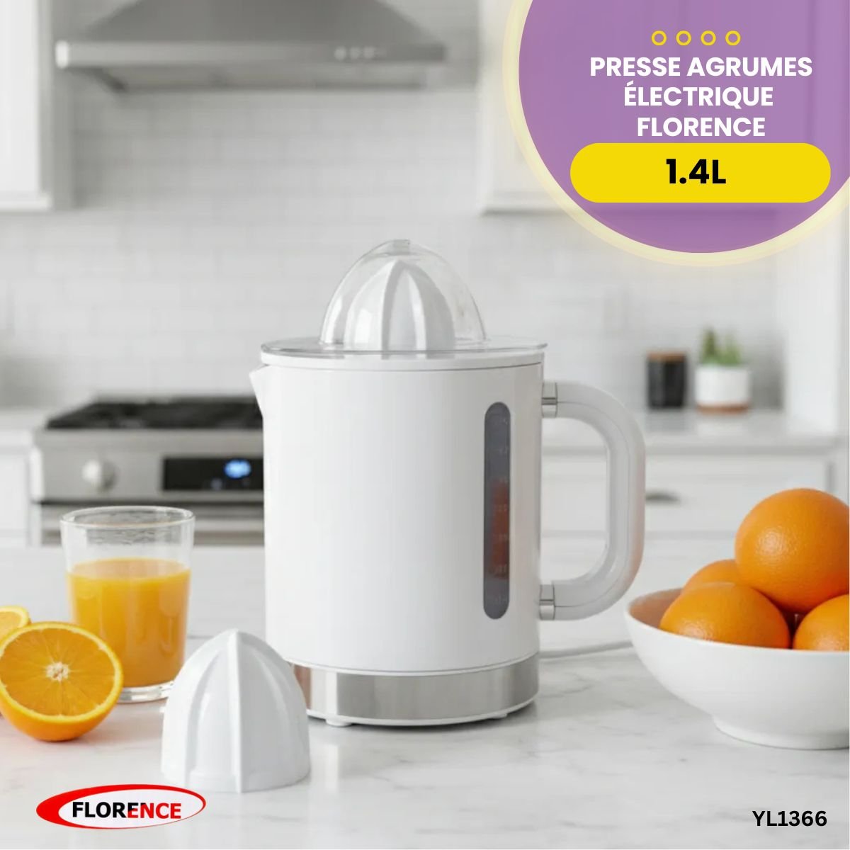 Presse-Agrumes Électrique Florence 1,4L. Extraction automatique bidirectionnelle. Idéal Oranges/Citrons. Réservoir gradué. Jus frais et sain facile.