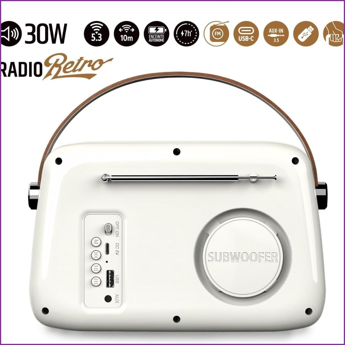 Le haut-parleur portable allie un design rétro et la puissance du Bluetooth. Profitez de la Radio FM, des ports USB et AUX. Idéal pour la maison ou les voyages.