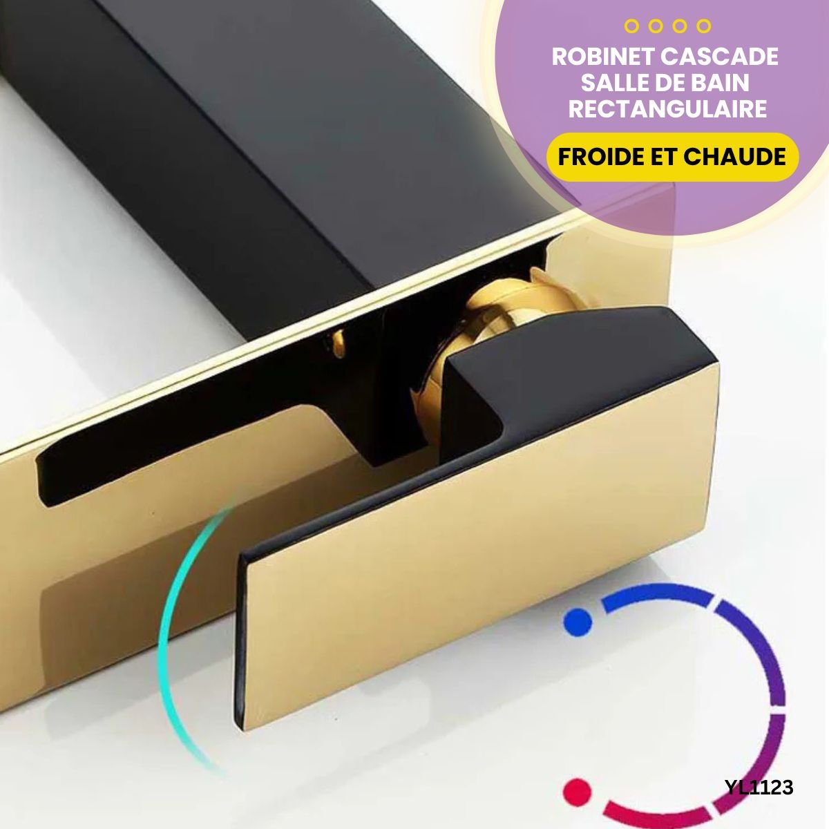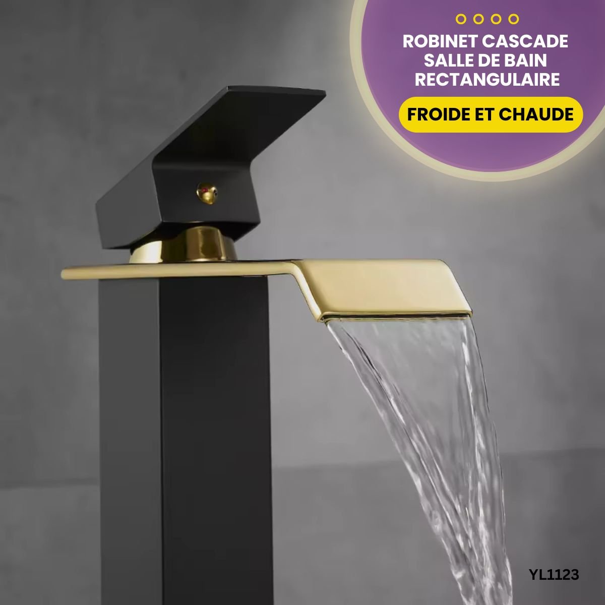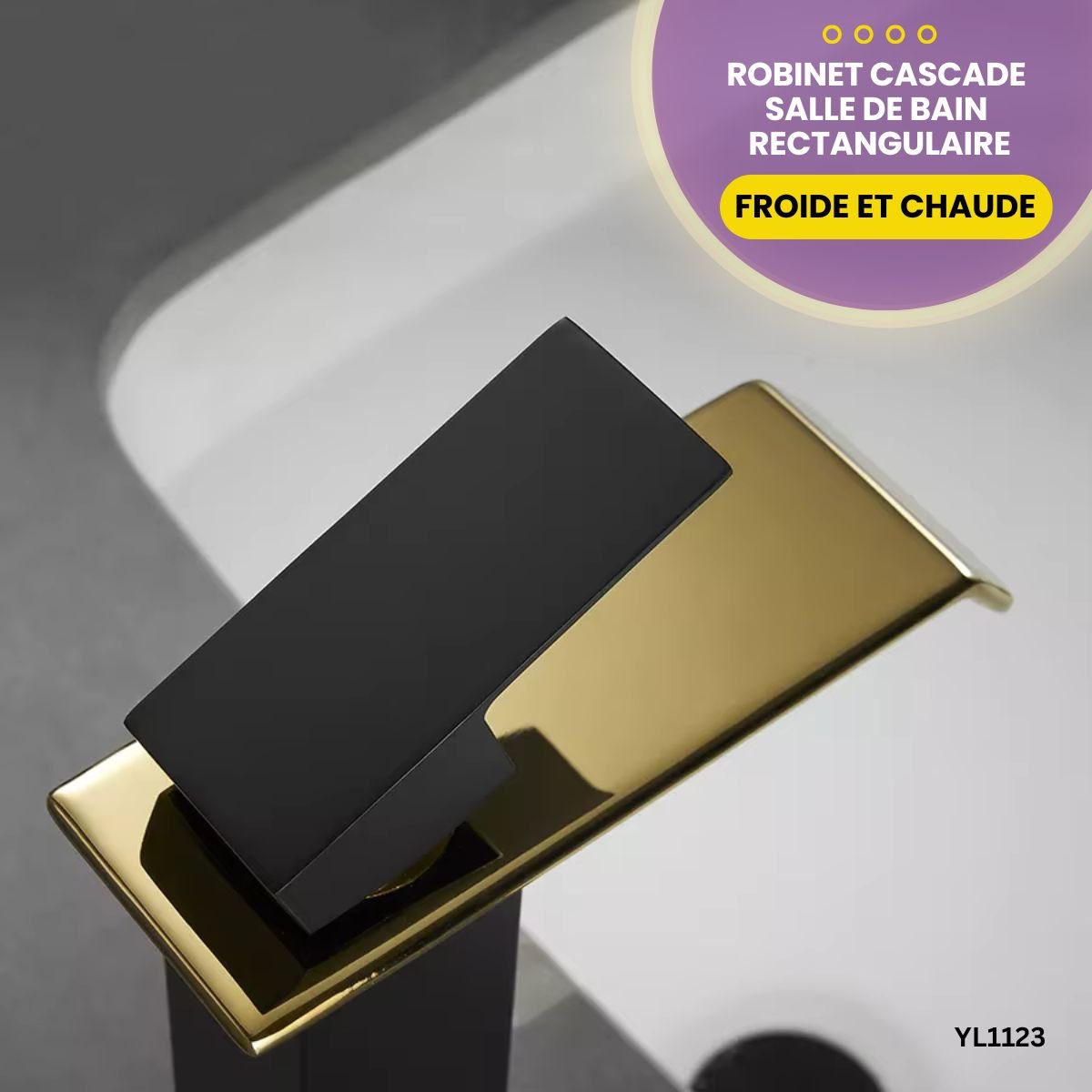 Robinet cascade rectangulaire YL1123 pour salle de bain moderne. Mitigeur eau chaude et froide, design élégant en noir et or. Allie esthétisme et performance.