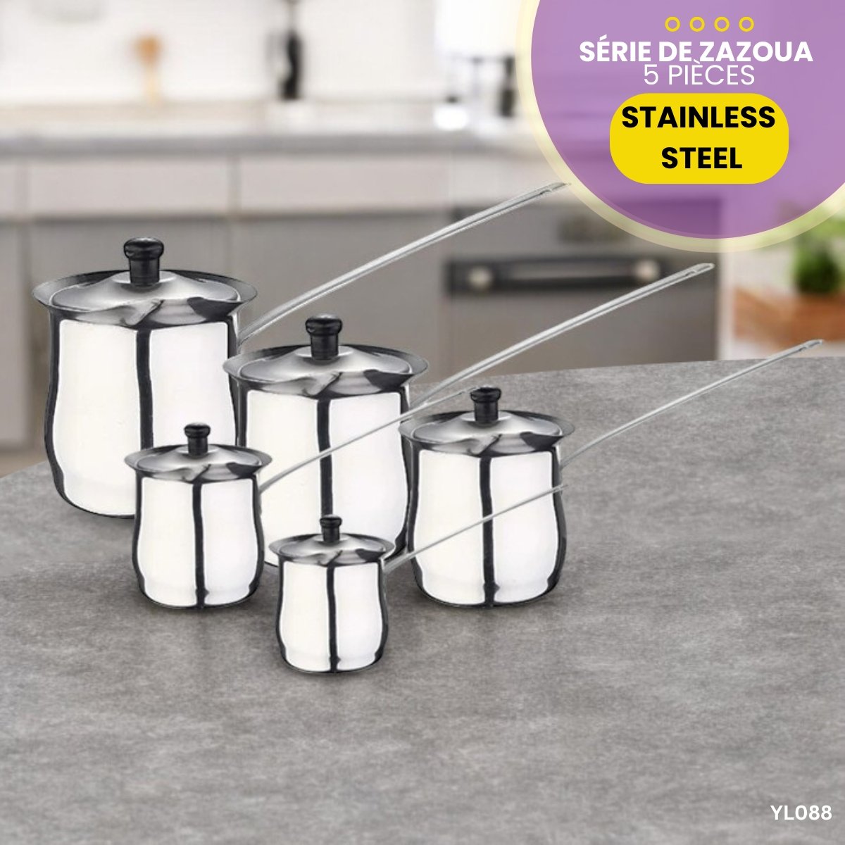 L'ensemble à café turc en acier inoxydable est un choix parfait pour ajouter une touche d'élégance à votre zazoua. Composé de 5 tasses de tailles variées avec des couvercles raffinés, cet ensemble allie esthétique et fonctionnalité. Ses longues poignées résistantes à la chaleur assurent une prise en main sûre et confortable, tandis que la lèvre de versement sans égouttage permet de verser le café sans créer de désordre. Compatible avec tous types de feux, y compris électriques et à gaz, cet ensemble se distingue par sa finition impeccable, offrant à la fois brillance et durabilité.
