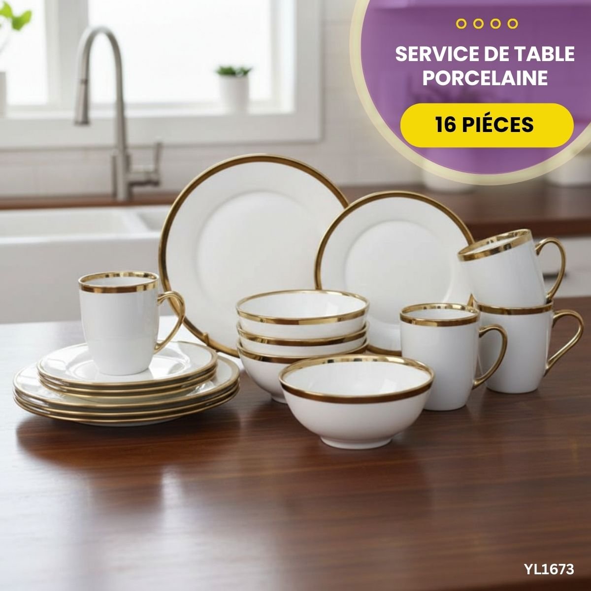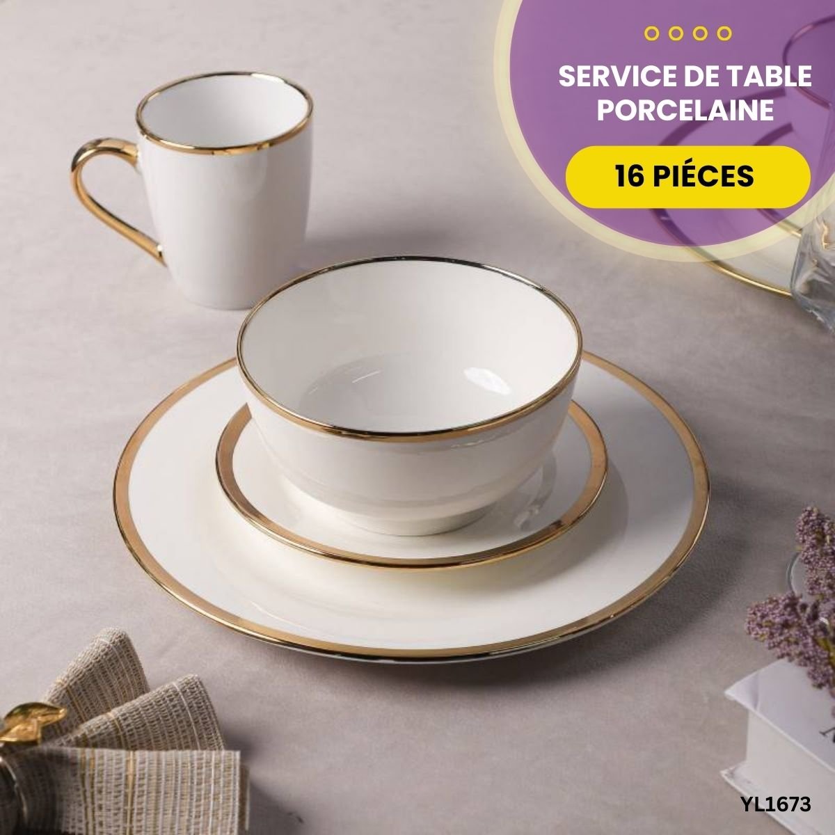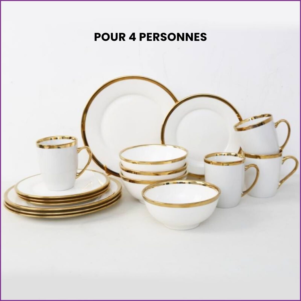 Sublimez vos repas avec le service Royal Gold Line 16 pièces. Porcelaine blanche premium et bordure dorée classique pour une table luxueuse et intemporelle.