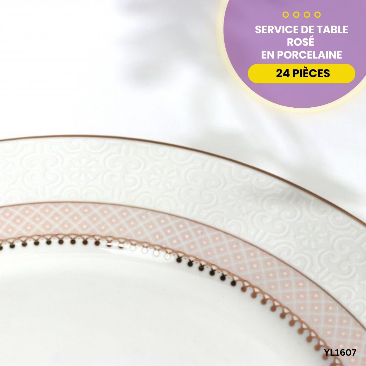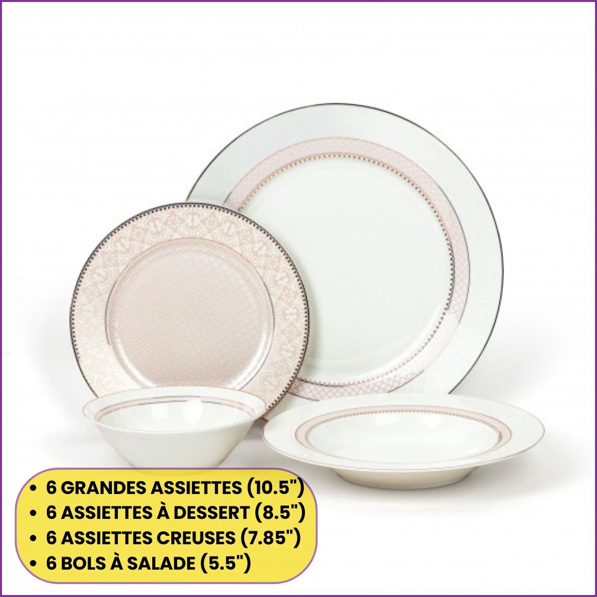 Redécouvrez le plaisir de recevoir avec ce somptueux service de table de 24 pièces. Conçu pour ceux qui apprécient le raffinement traditionnel, ce set en porcelaine se distingue par ses bordures travaillées aux motifs géométriques et floraux subtils, rehaussés de touches dorées et de nuances vieux rose. C'est l'ensemble idéal pour transformer vos repas quotidiens en véritables moments d'exception.