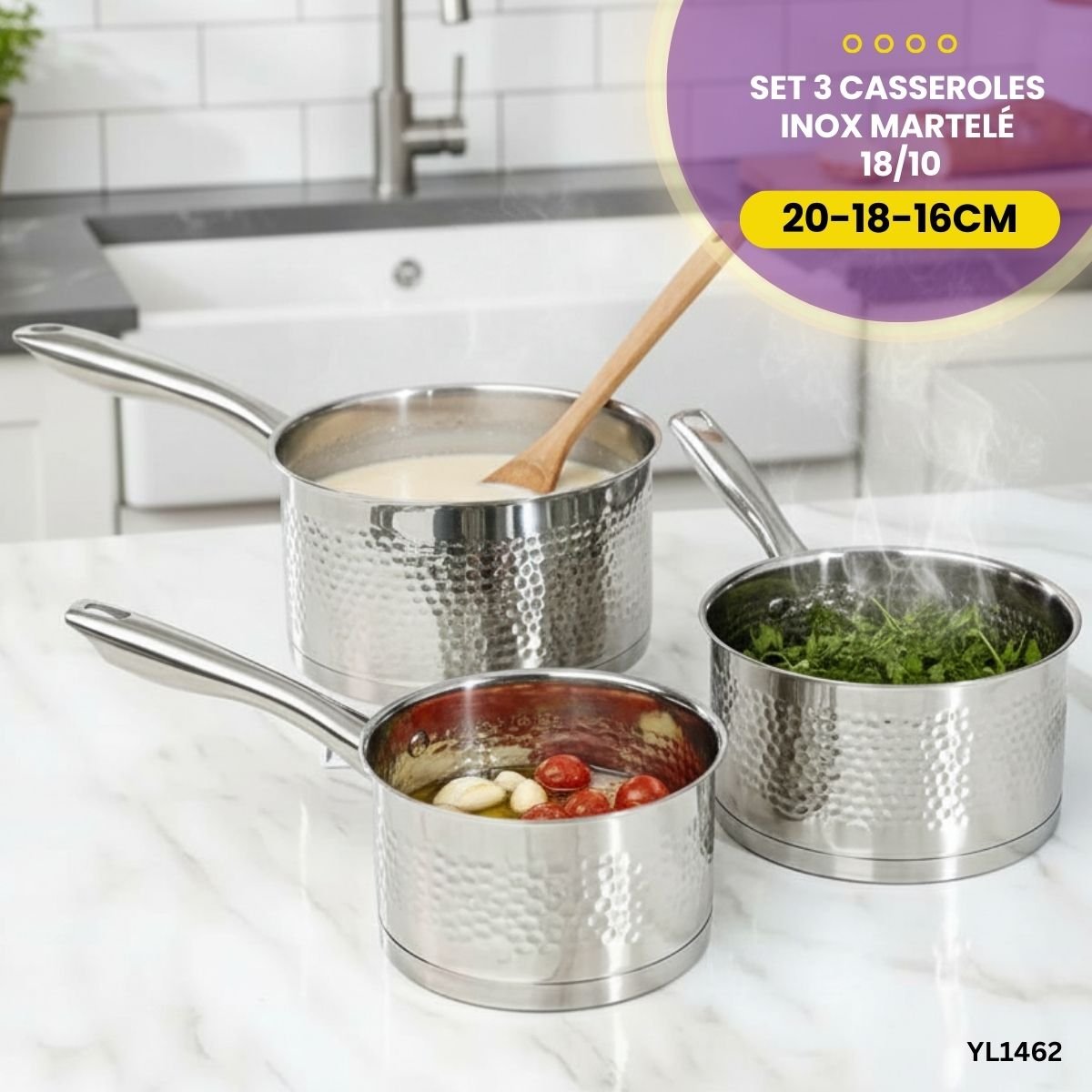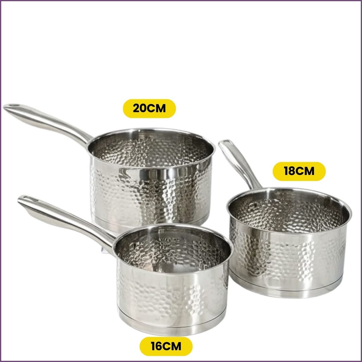 Trio de casseroles à manche en inox martelé (16-18-20cm). Design luxe et professionnel. Idéales pour sauces, crèmes et cuisson rapide.