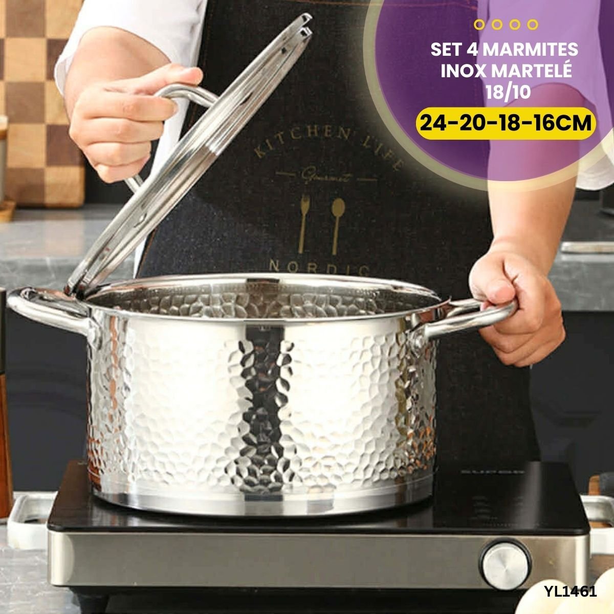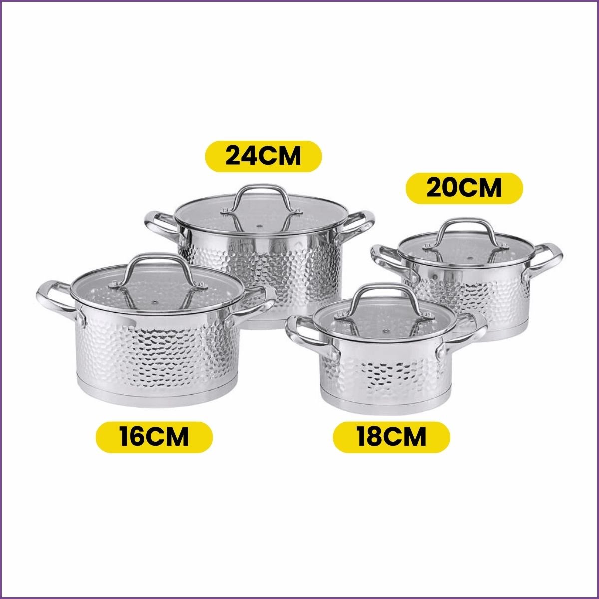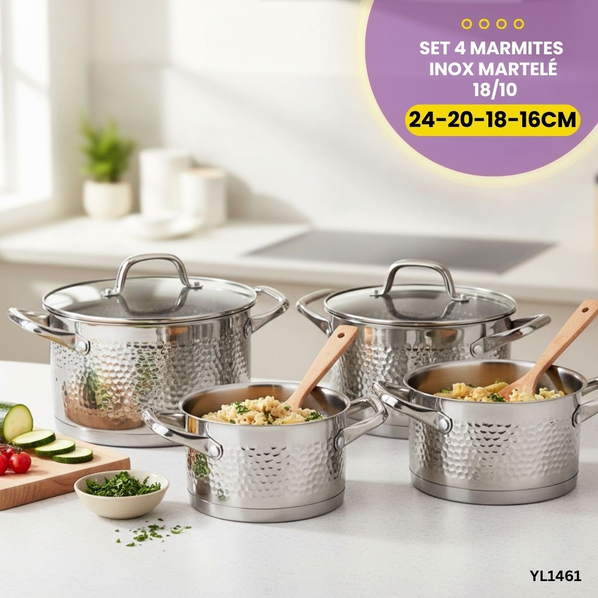 Set 4 Marmites Inox Martelé (diamètres 16, 18, 20, 24 cm). Design chic et durabilité professionnelle. Couvercles en verre inclus