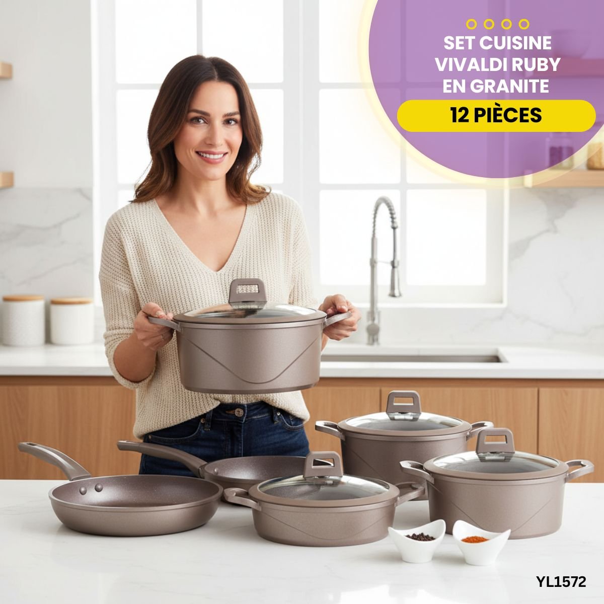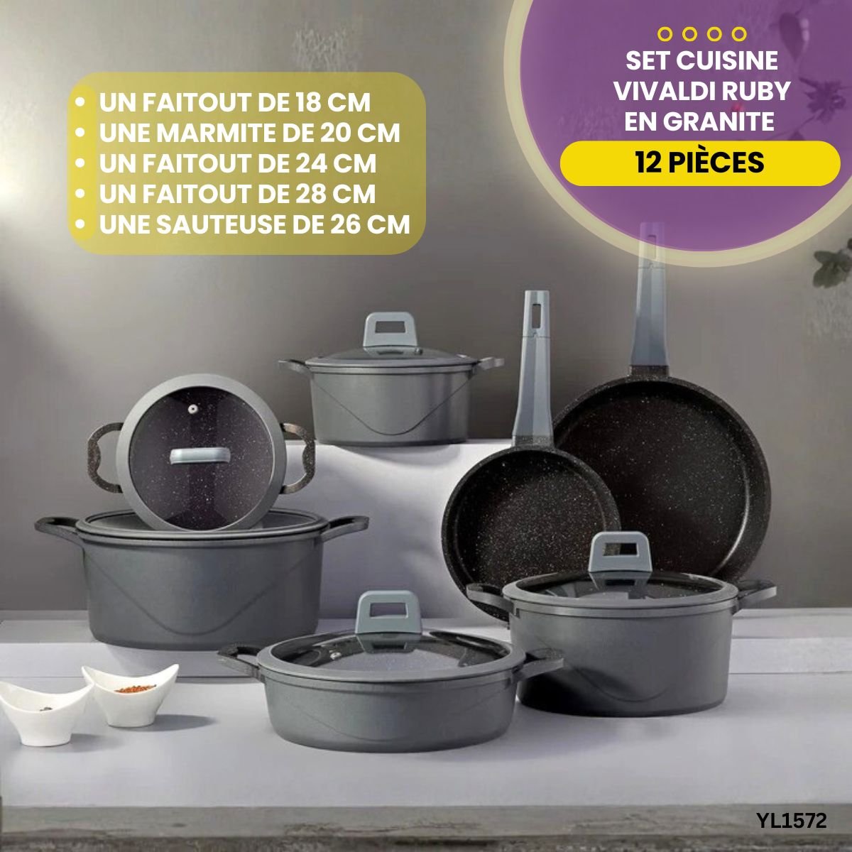 Le set de cuisine Vivaldi Ruby de 12 pièces redéfinit l'élégance et la performance au sein de votre foyer. Grâce à sa fabrication en aluminium moulé sous pression (die-cast), cet ensemble assure une solidité exceptionnelle pour vos repas quotidiens. Par ailleurs, son design moderne est magnifié par un revêtement en granite couleur rubis qui apporte une touche de luxe immédiate à votre plan de travail.