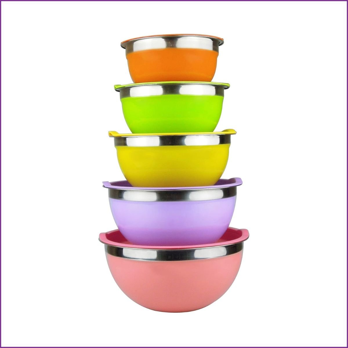 Set de 5 bols en inox avec couvercles hermétiques. Idéal pour mélanger, conserver ou servir vos plats. Design coloré, empilable et facile à nettoyer.