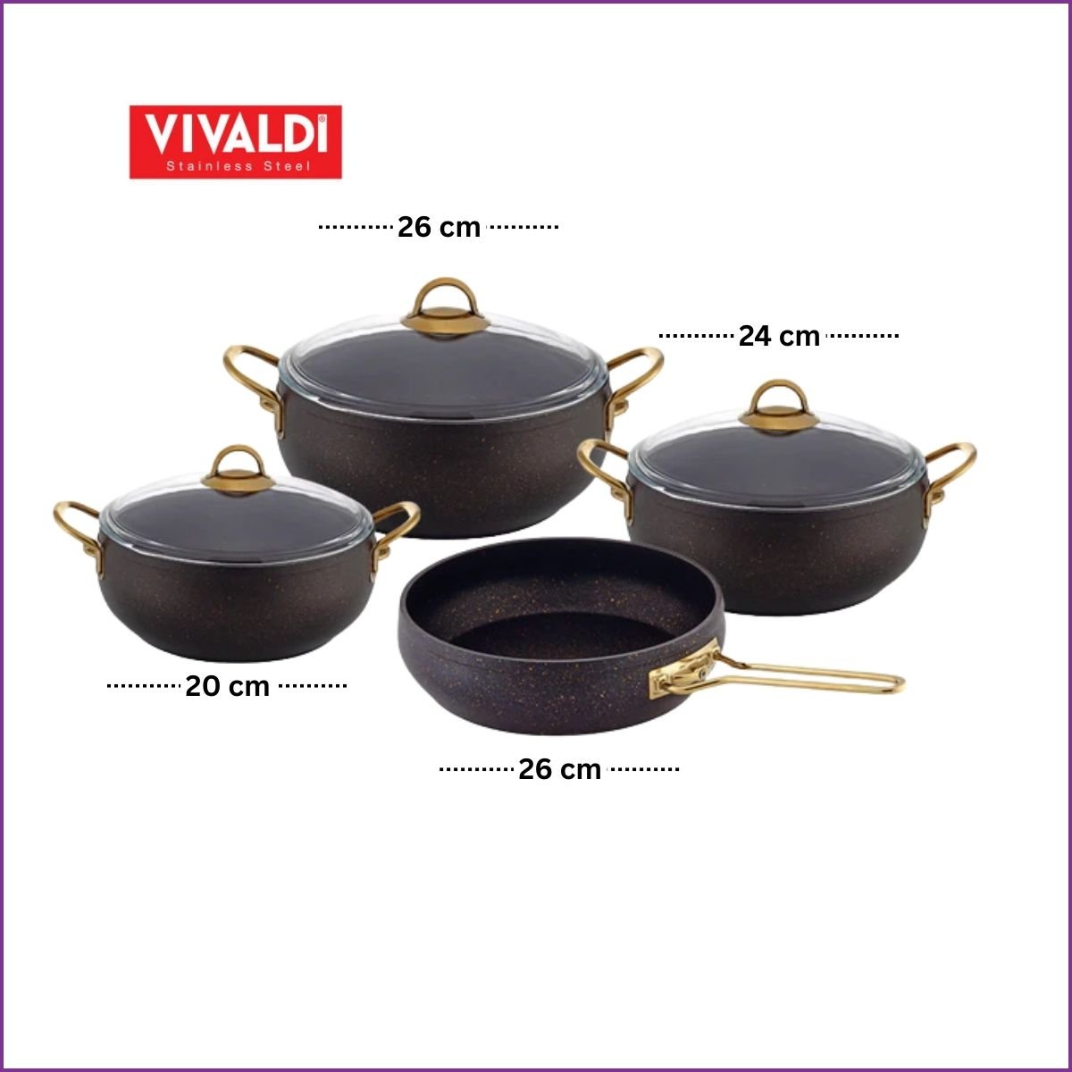 Optimisez votre cuisine avec le set Vivaldi Babil de 7 pièces. Revêtement granit antiadhésif, poignées dorées élégantes et compatible tous feux, dont induction.