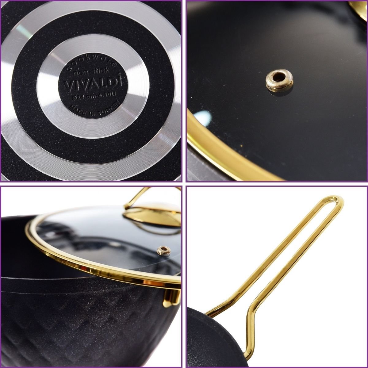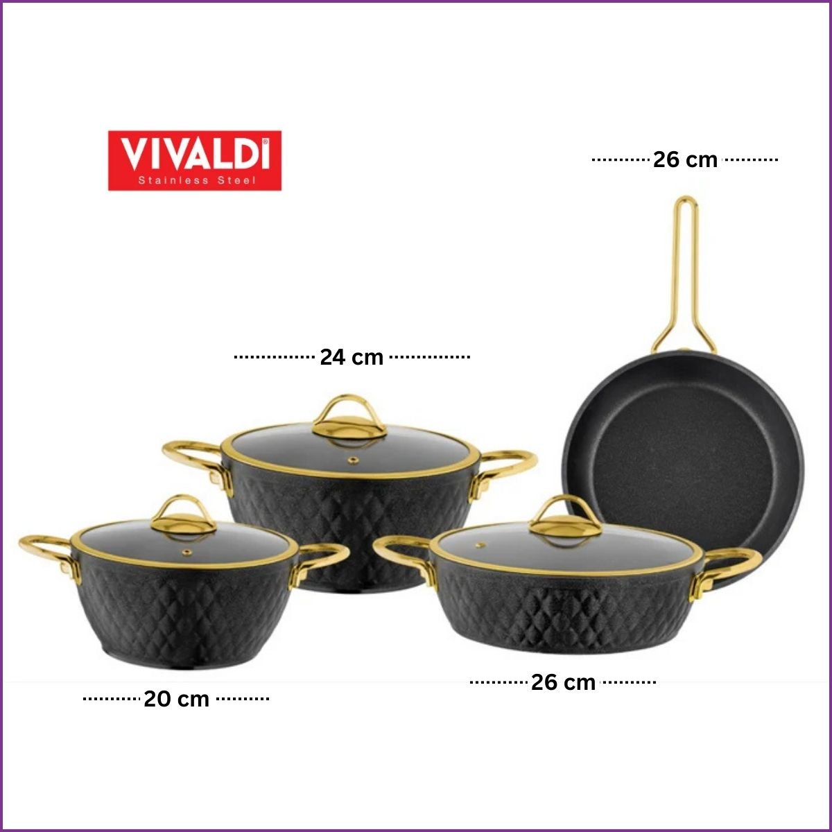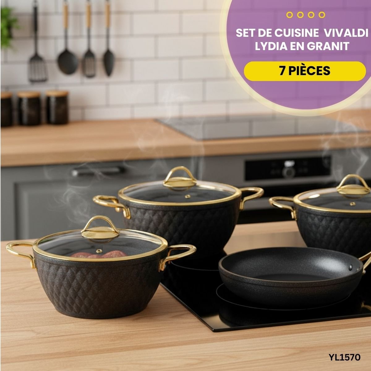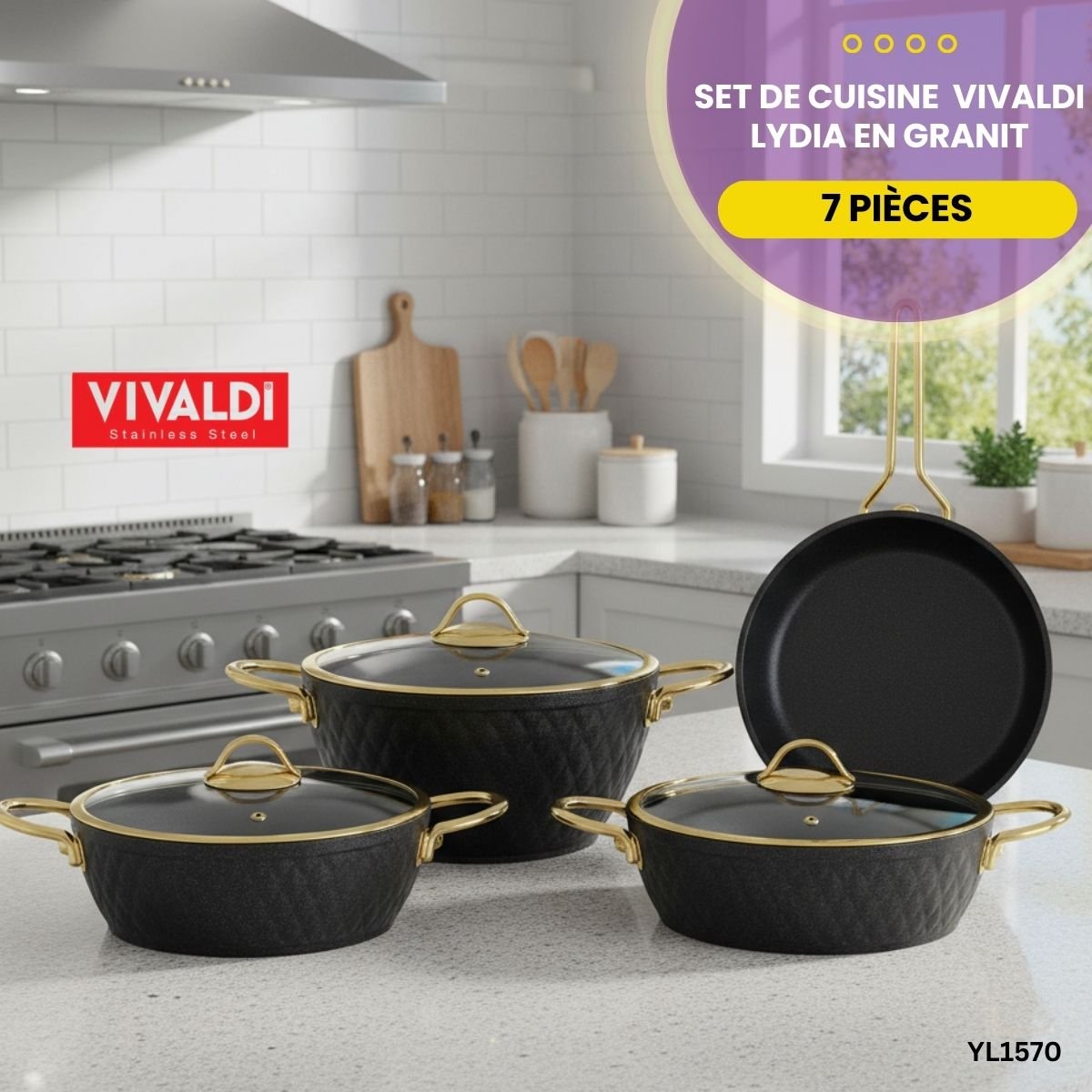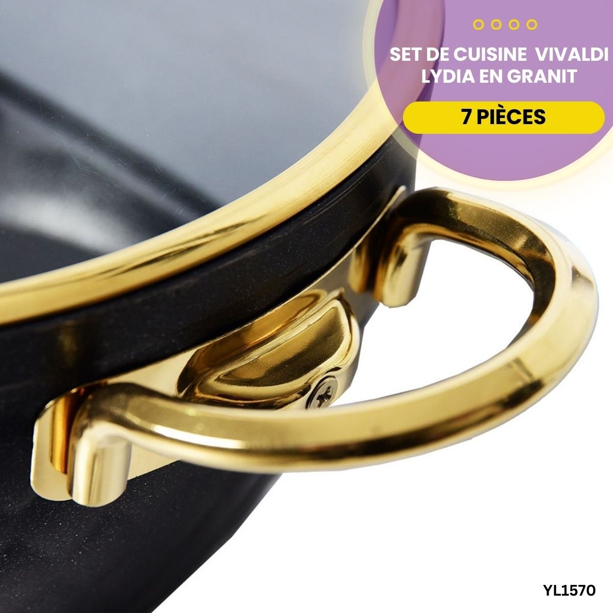 Sublimez votre cuisine avec le set Vivaldi Lydia. 7 pièces en granit , revêtement titane antiadhésif et finitions dorées pour une cuisson d’élite.