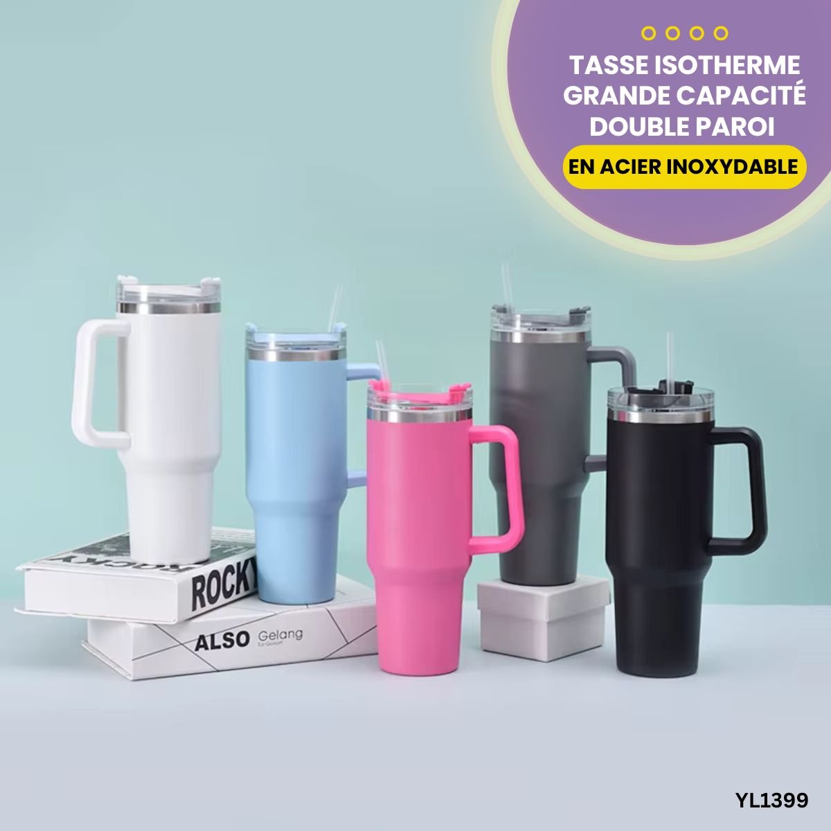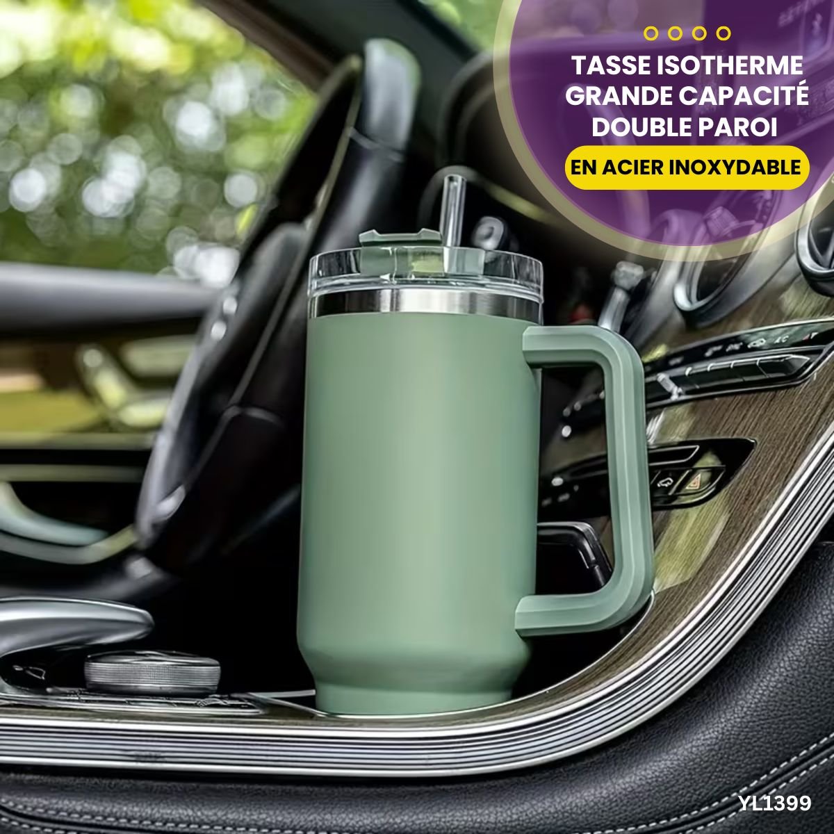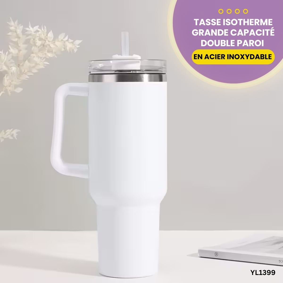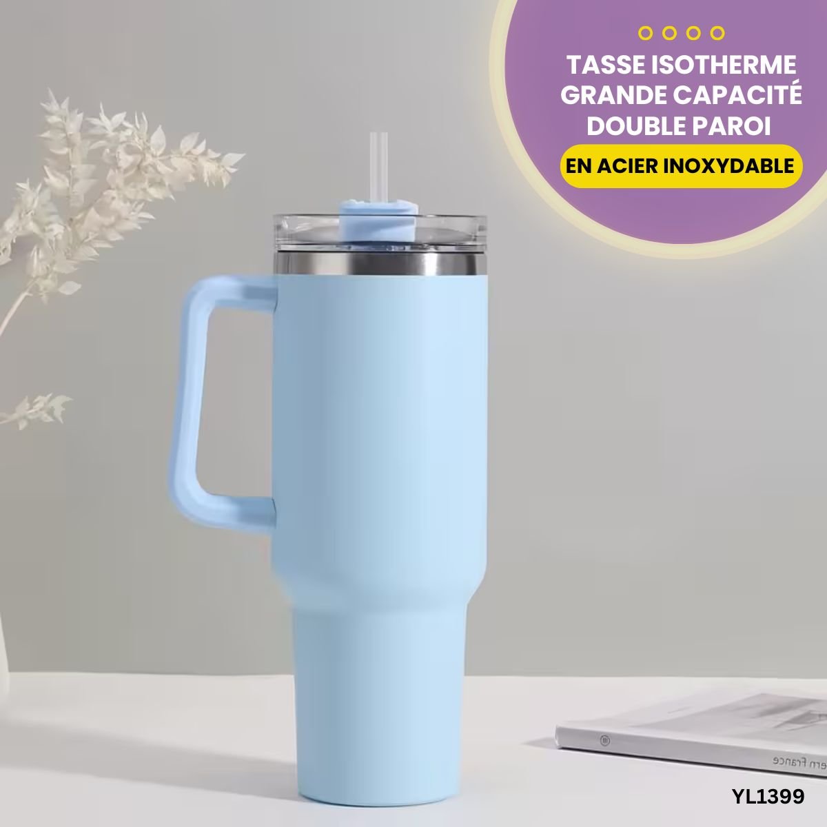 Grande tasse isotherme de 40oz (environ 1.2L) en acier Inox 304. Maintien 12H froid / 6H chaud. Poignée ergonomique. Passe au lave-vaisselle.