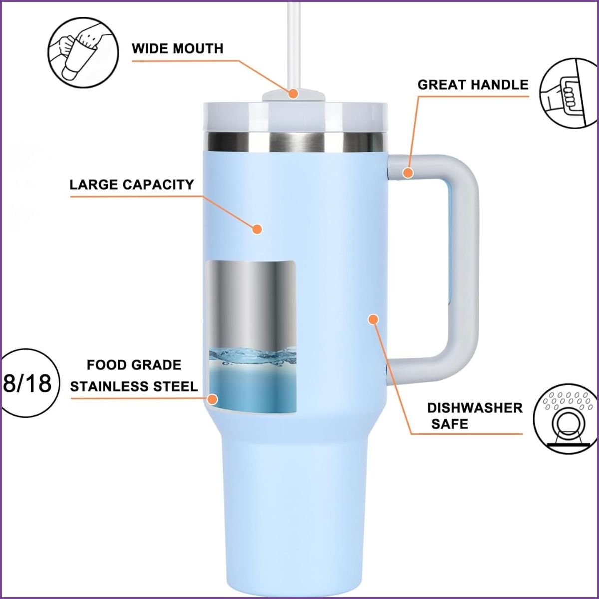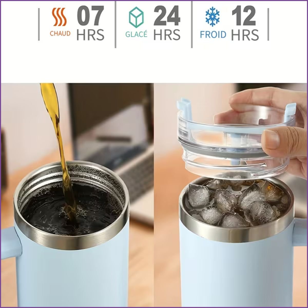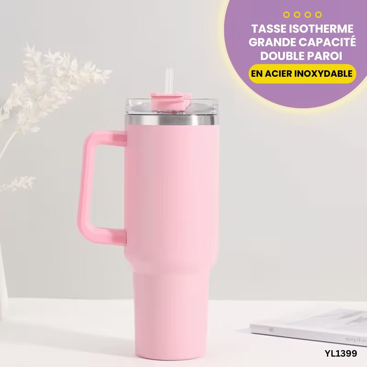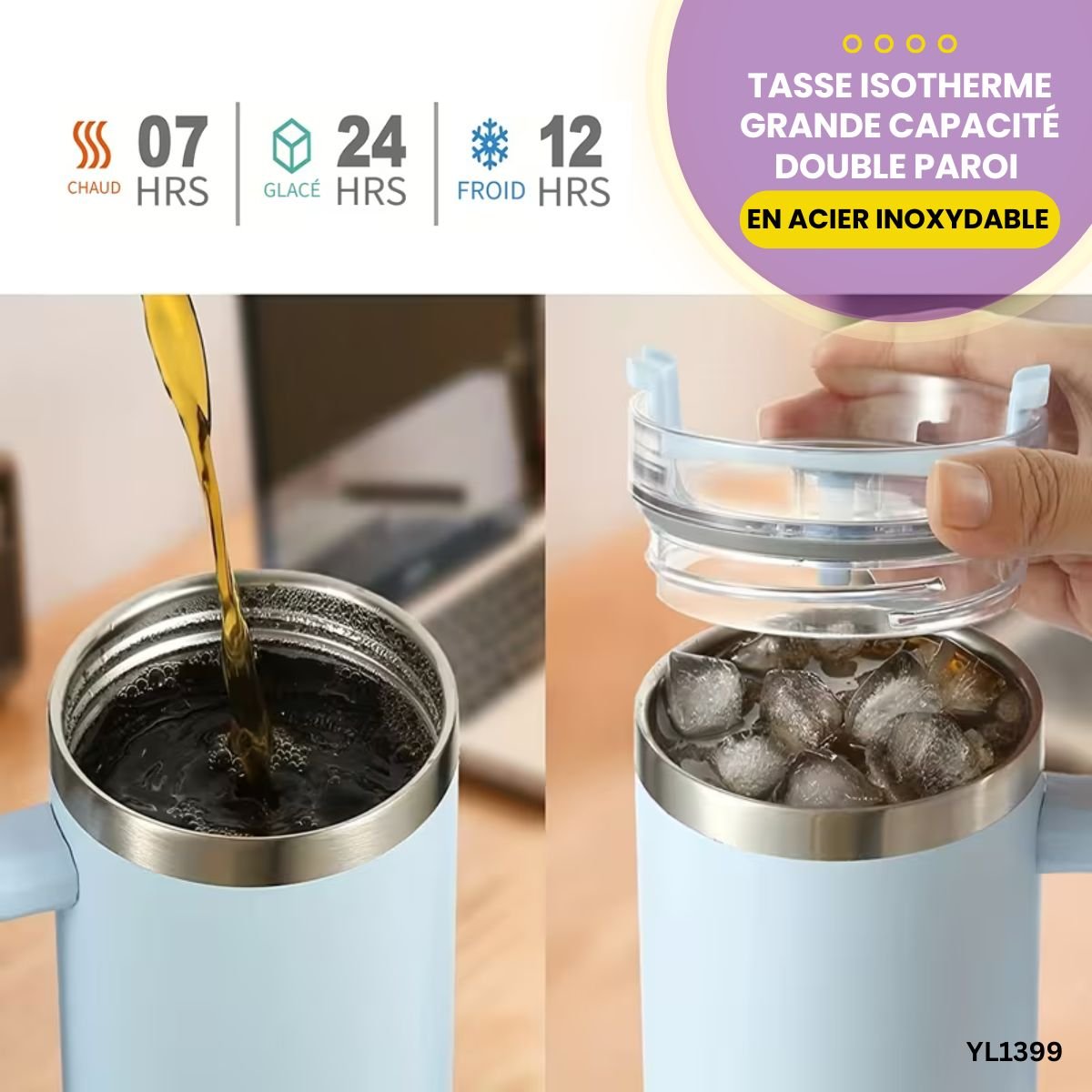 Grande tasse isotherme de 40oz (environ 1.2L) en acier Inox 304. Maintien 12H froid / 6H chaud. Poignée ergonomique. Passe au lave-vaisselle.