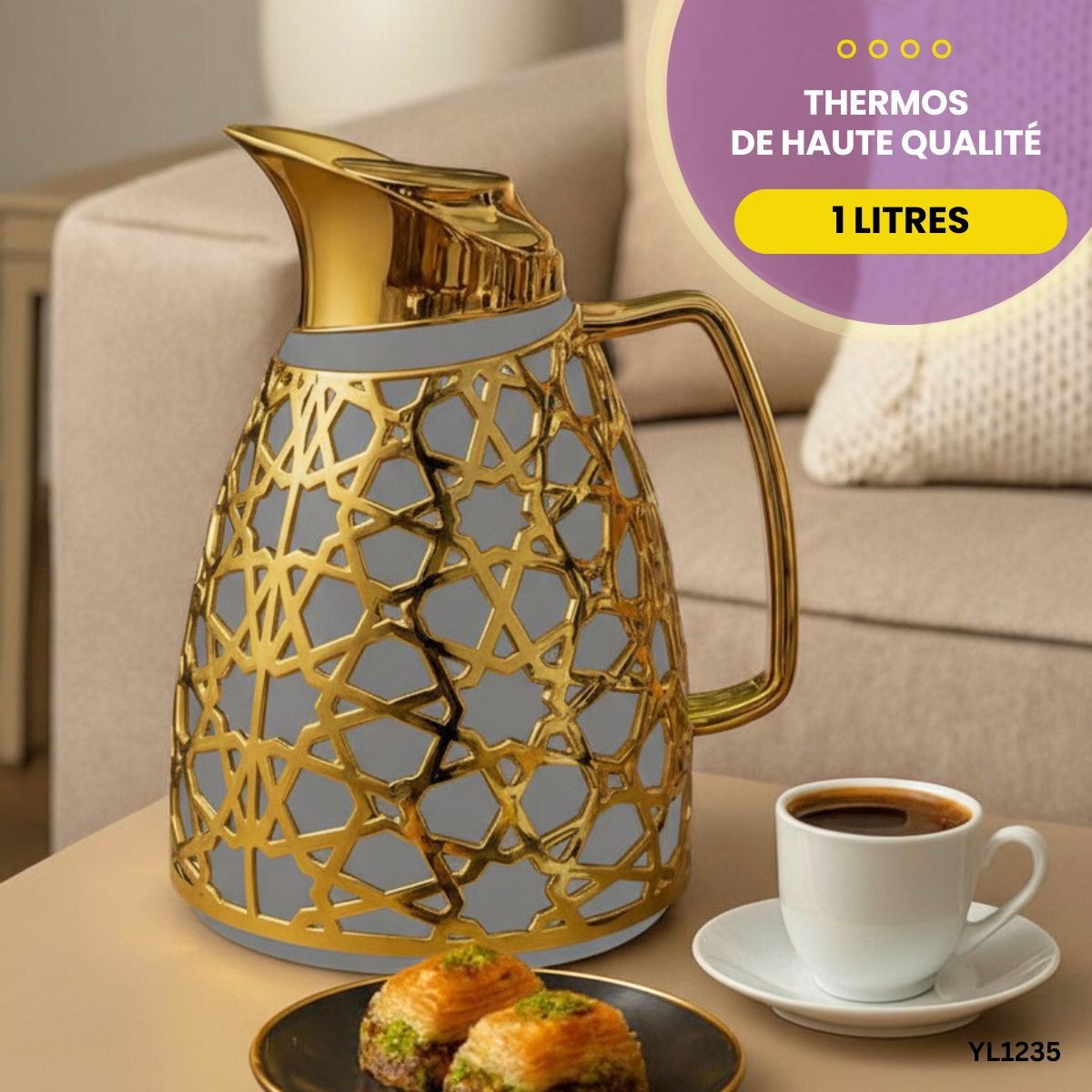 Apportez une touche d’élégance à vos moments café ou thé avec ce thermos de haute qualité de 1 litre, au design raffiné doré inspiré des motifs orientaux. Le modèle YL1235 est conçu pour allier esthétique et performance : son isolation thermique performante permet de conserver vos boissons chaudes ou froides pendant de longues heures, tout en ajoutant du cachet à votre table.