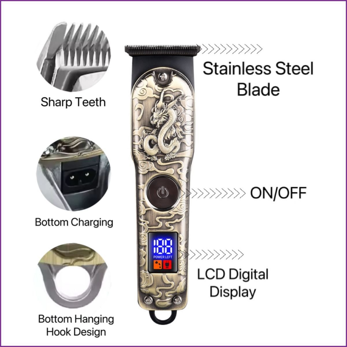 Tondeuse à cheveux professionnelle sans fil YACEN YC-1607 au design vintage Dragon. Lame en acier inoxydable à dents aiguisées pour une coupe précise.