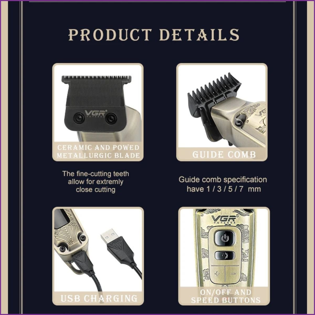 Tondeuse Pro VGR V-005 Métal Or : Lame Hybride Céramique, Moteur 7000 tr/min à 4 vitesses, Batterie 2600mAh (250 min autonomie).Design vintage haut de gamme.